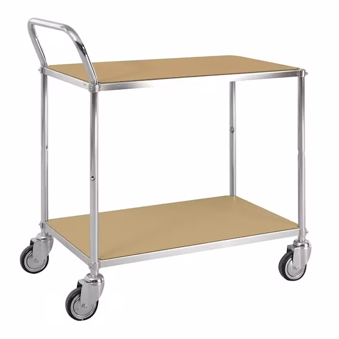 Bordsvagn i 2 plan. Med endast ett handtag så får man en stor och bra lastyta på det övre hyllplanet. Finns som standard i 2 modeller.