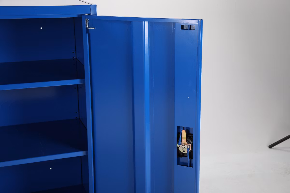 Stabilt omonterat stålskåp. Monteras enkelt utan skruvar och verktyg genom en smart konstruktion.