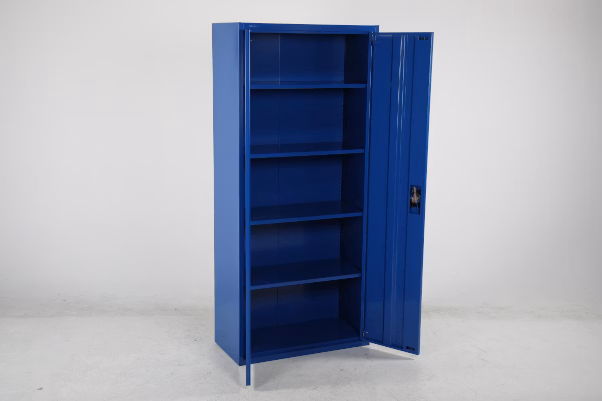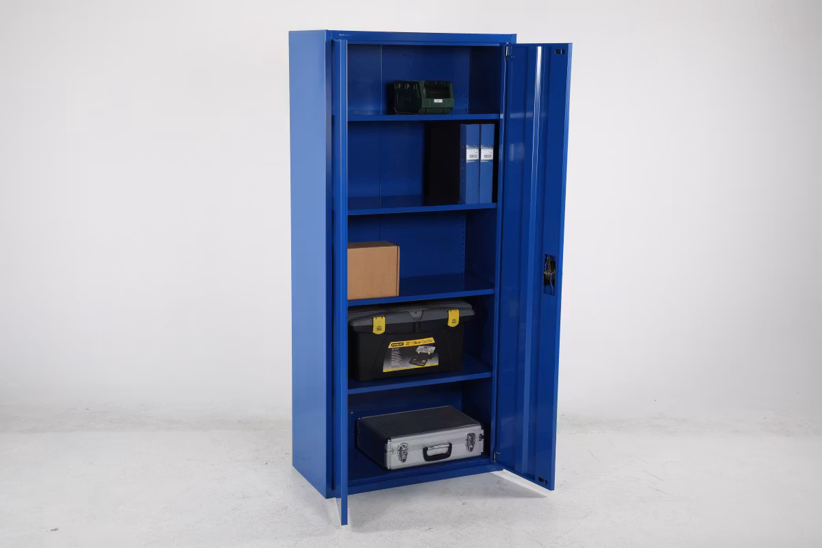 Stabilt omonterat stålskåp. Monteras enkelt utan skruvar och verktyg genom en smart konstruktion. 4 st. hyllplan med hyllhakar ingår