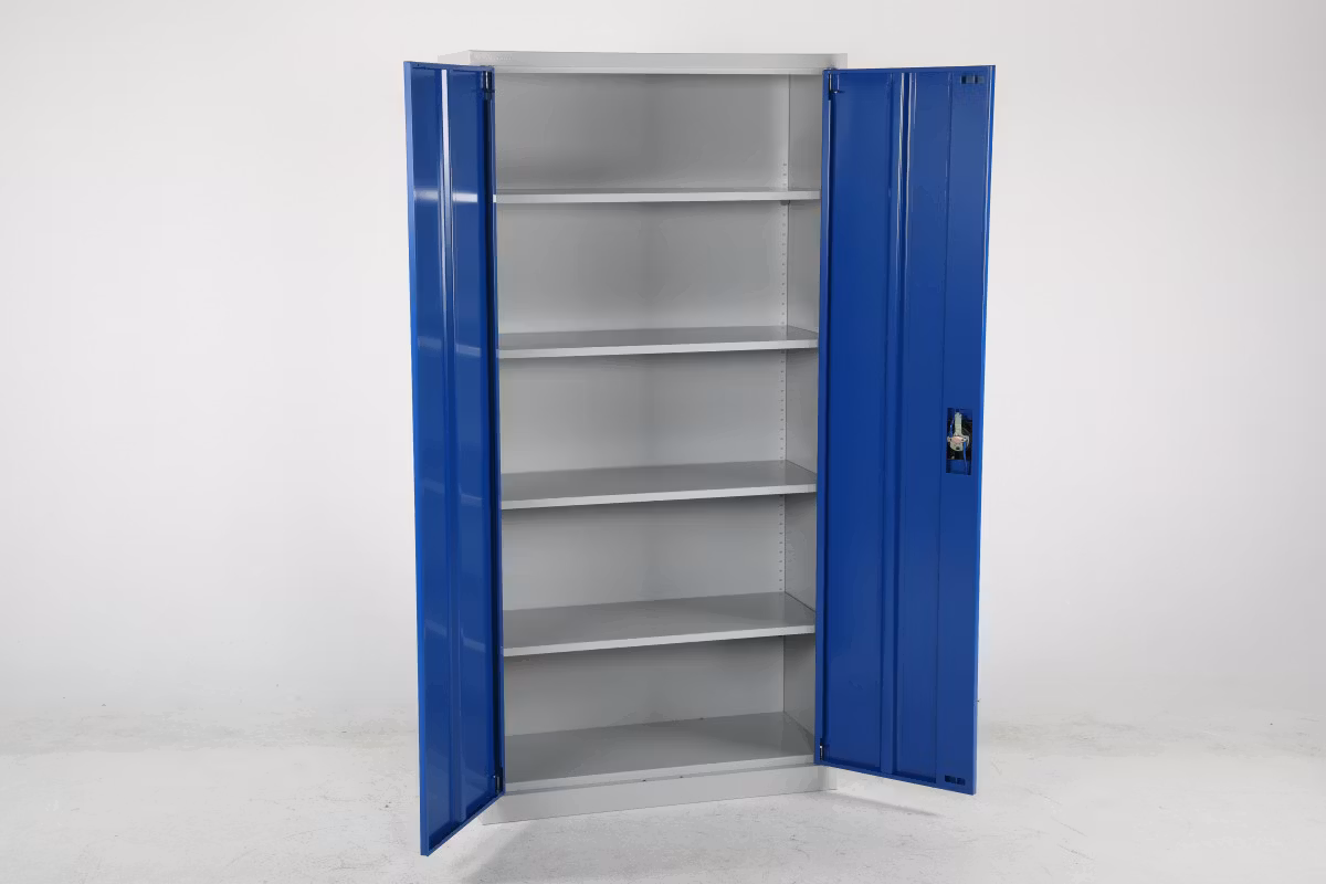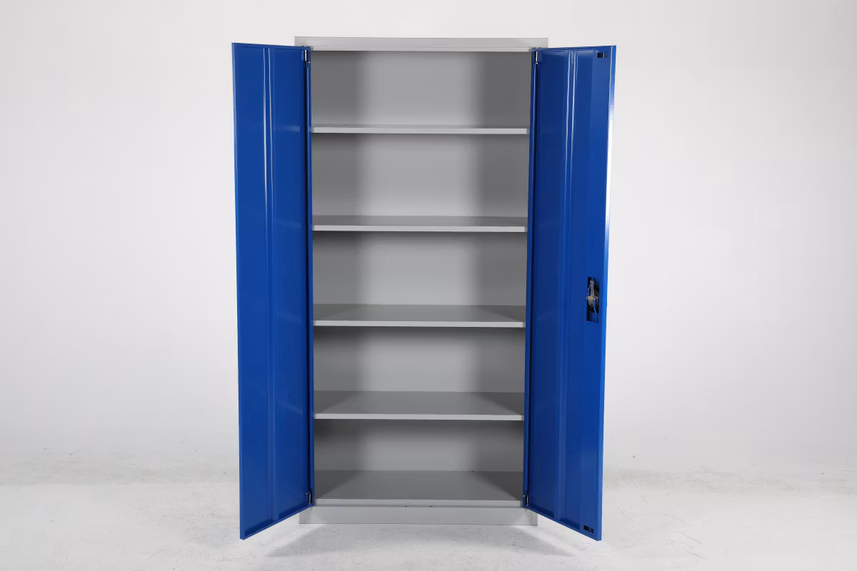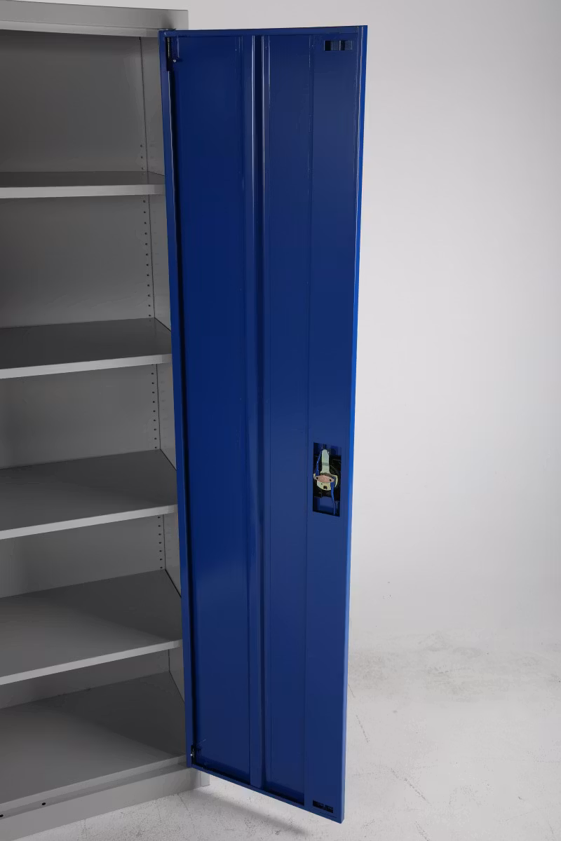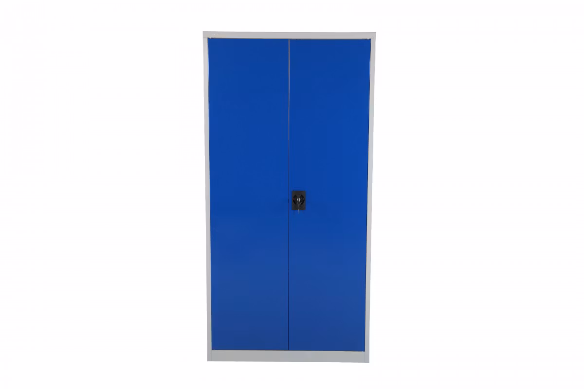 Metallskåp med 2 st dörrar och 4 st ställbara hyllplan. Lås med nyckel, 2 st nycklar medföljer.