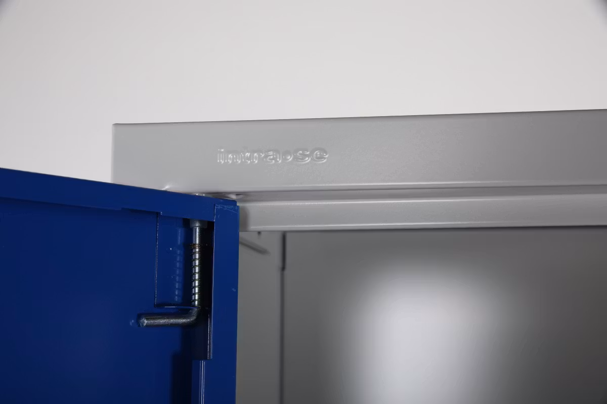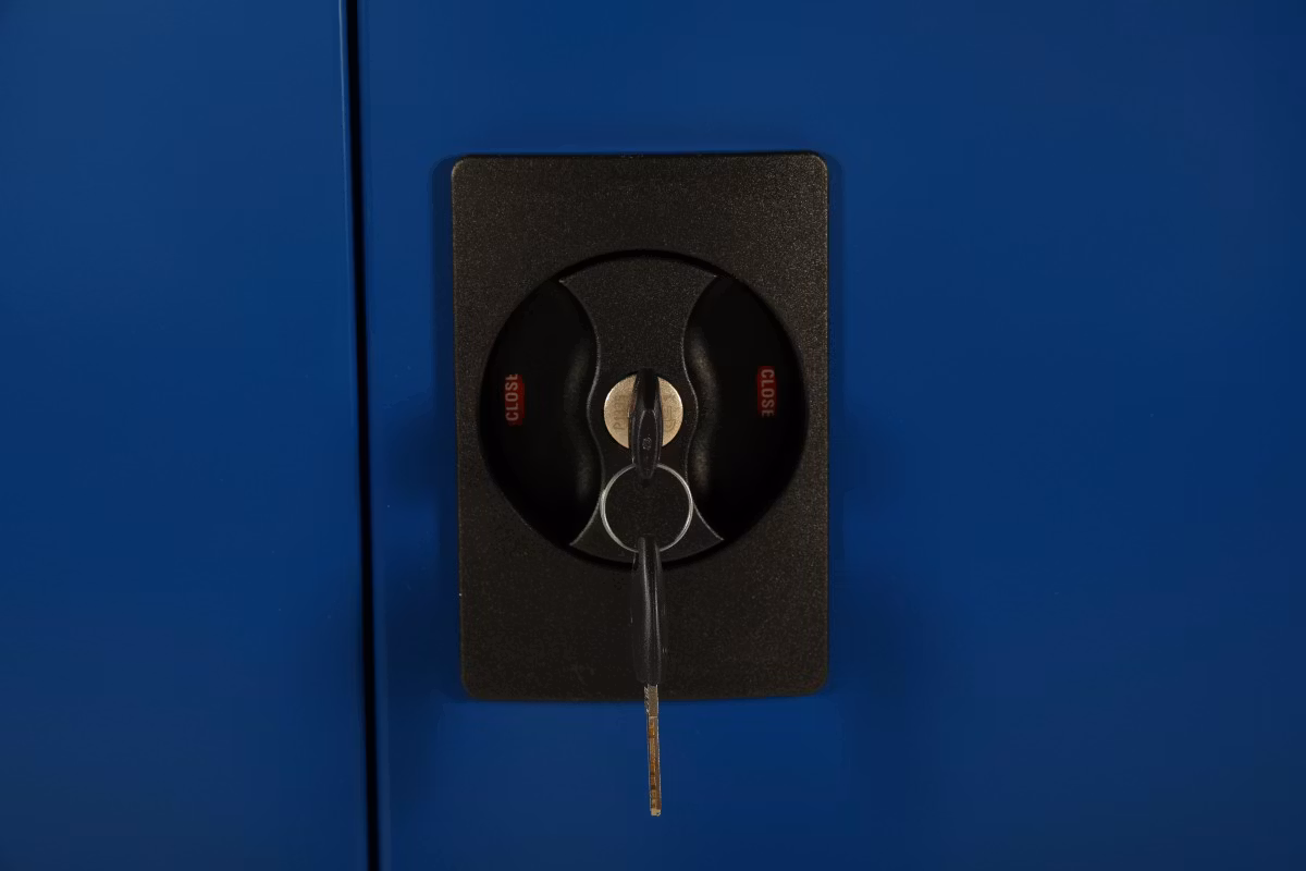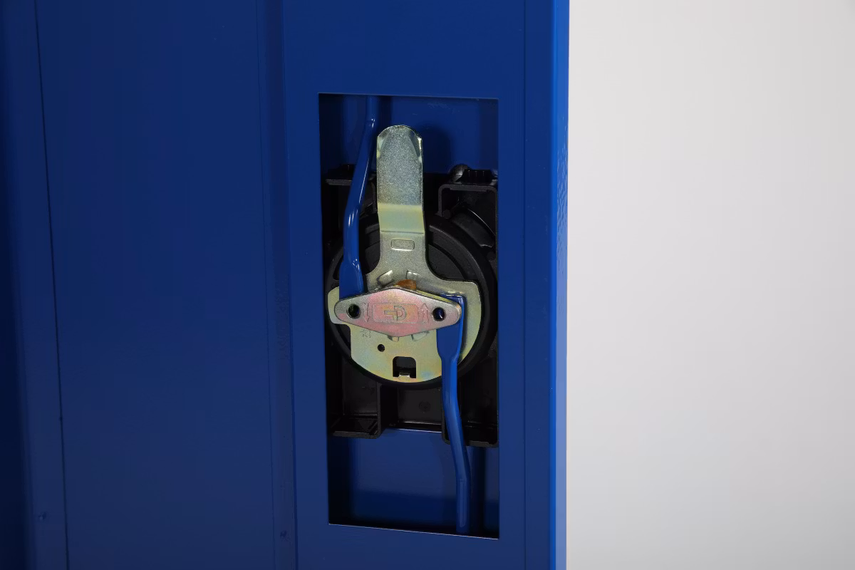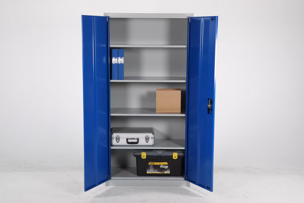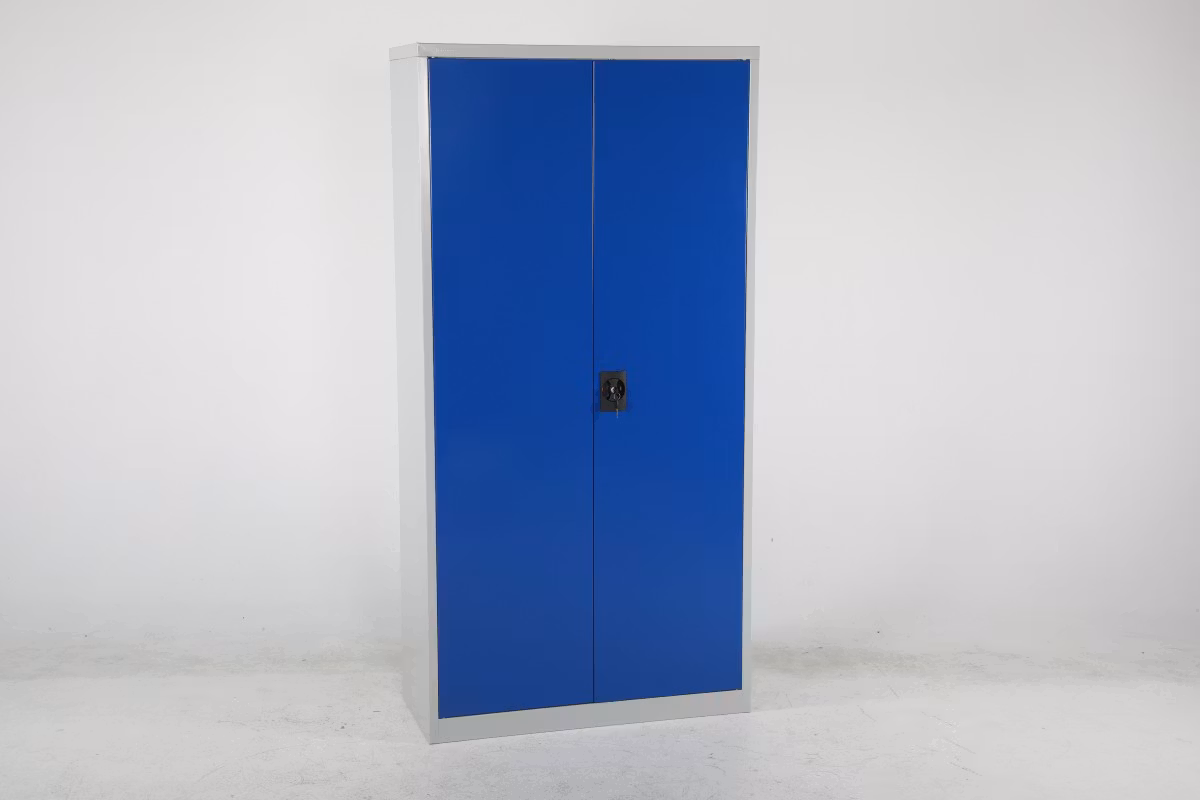 Metallskåp med 2 st dörrar och 4 st ställbara hyllplan. Lås med nyckel, 2 st nycklar medföljer.