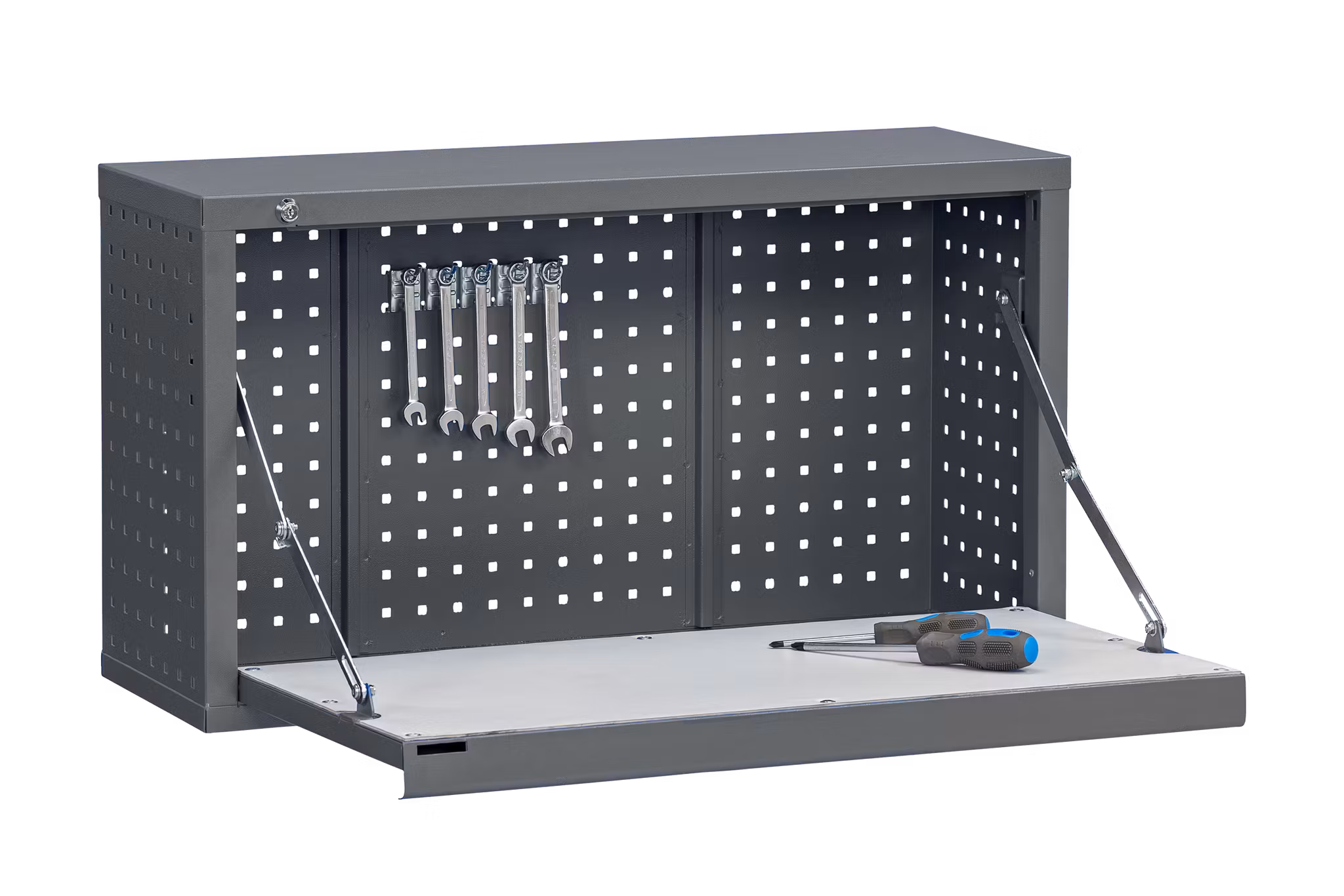 Perforerat verktygsskåp inklusive fällbar arbetsyta.