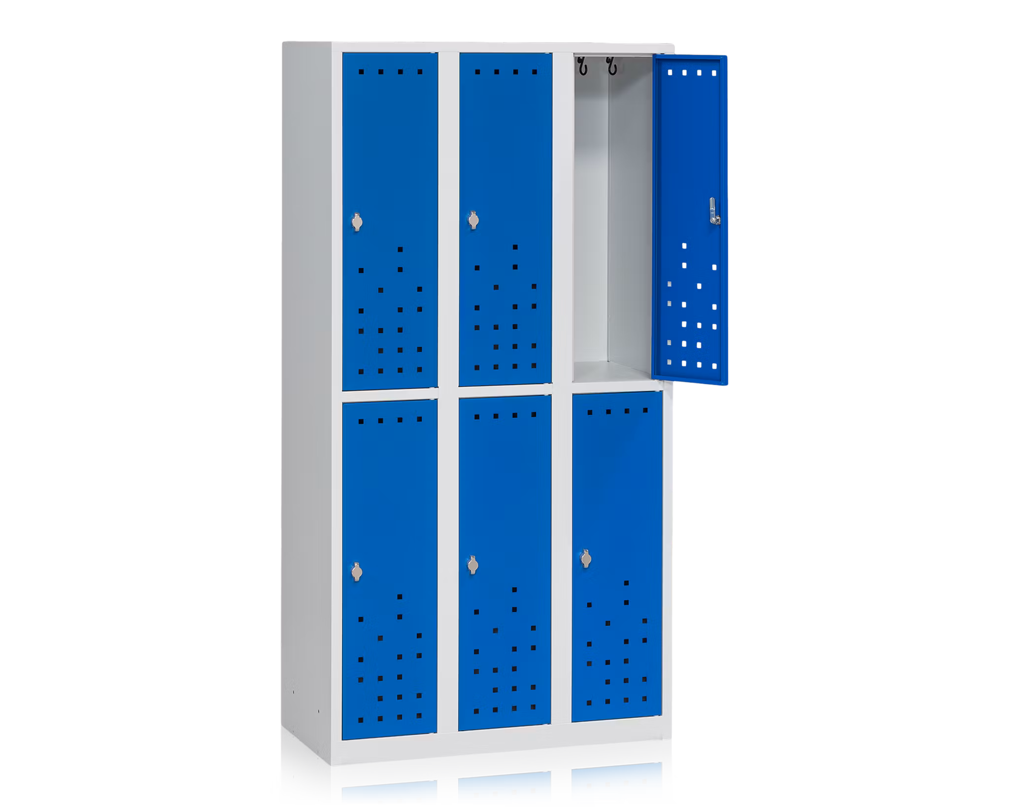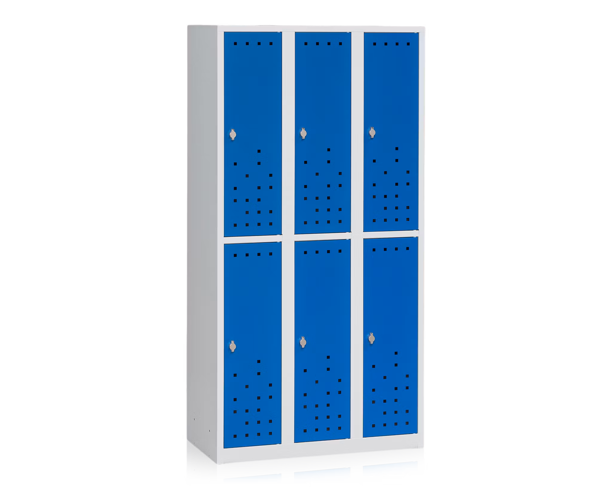 Helsvetsat och pulverlackerat klädskåp med 6 dörrar tillverkat av stålplåt. Lackeringen ger en stryktålig yta, vilket gör att klädskåpet lämpar sig speciellt bra i offentliga miljöer som till exempel gym, badhus, idrottsanläggningar, kontor och omklädningsrum på arbetsplatser.