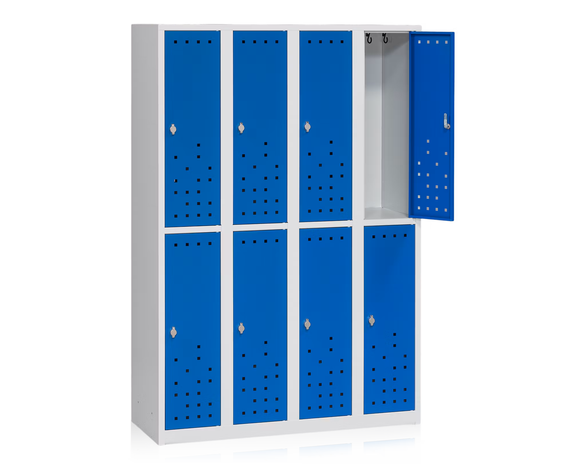 Helsvetsat och pulverlackerat klädskåp med åtta dörrar tillverkat av stålplåt. Lackeringen ger en stryktålig yta, vilket gör att klädskåpet lämpar sig speciellt bra i offentliga miljöer som till exempel gym, badhus, idrottsanläggningar, kontor och omklädningsrum på arbetsplatser.