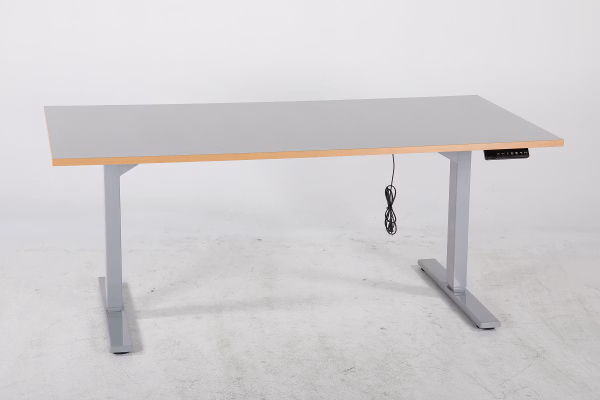 Arbetsbord med elektriskt justerbara bordsben och 20mm bordsskiva i ljusgrå laminat, höjdinställning mellan 640-1290 mm. Perfekt anpassat för kontors- och lätta