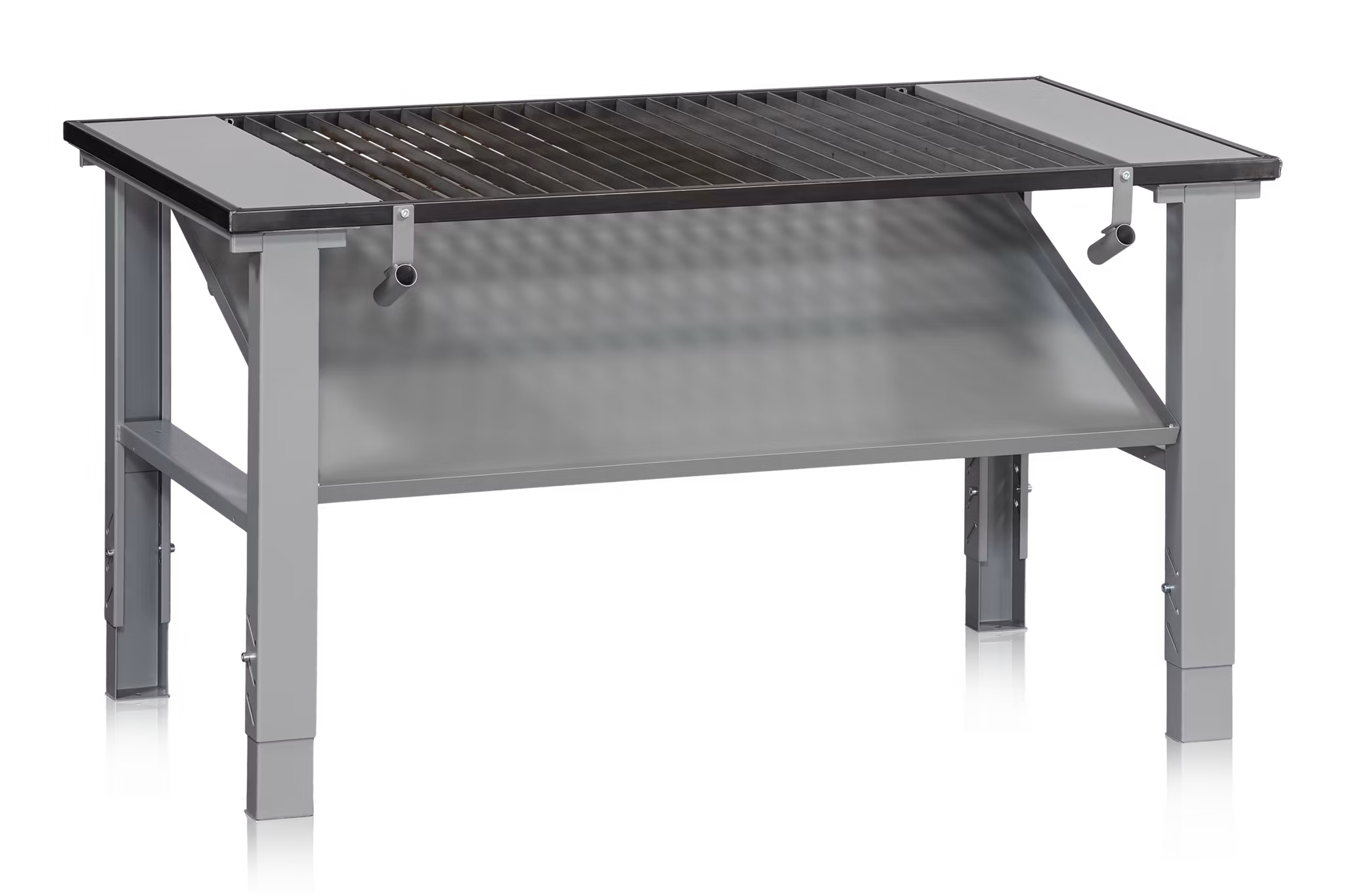 Stabilt svetsbord som bygger på benbock HD500. Bordet är manuellt justerbart med en lägsta höjd på 750 mm och en högsta höjd på 1020 mm. Arbetsytan har stående plattjärn som ligger i en stålrörsram och lämpar sig både för lödning och svetsning.