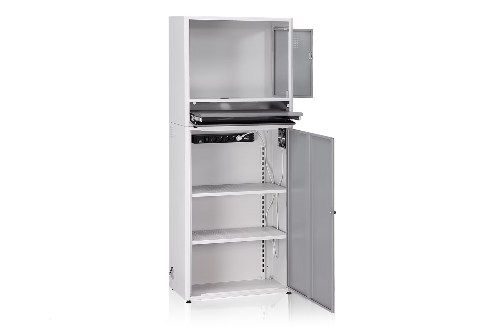 Komplett datorskåp för industri och lager. Skåpet skyddar din dator från damm och smuts på ett effektivt sätt, och är samtidigt fullt ventilerbart. Fläkt monteras på insidan av underskåpet.
