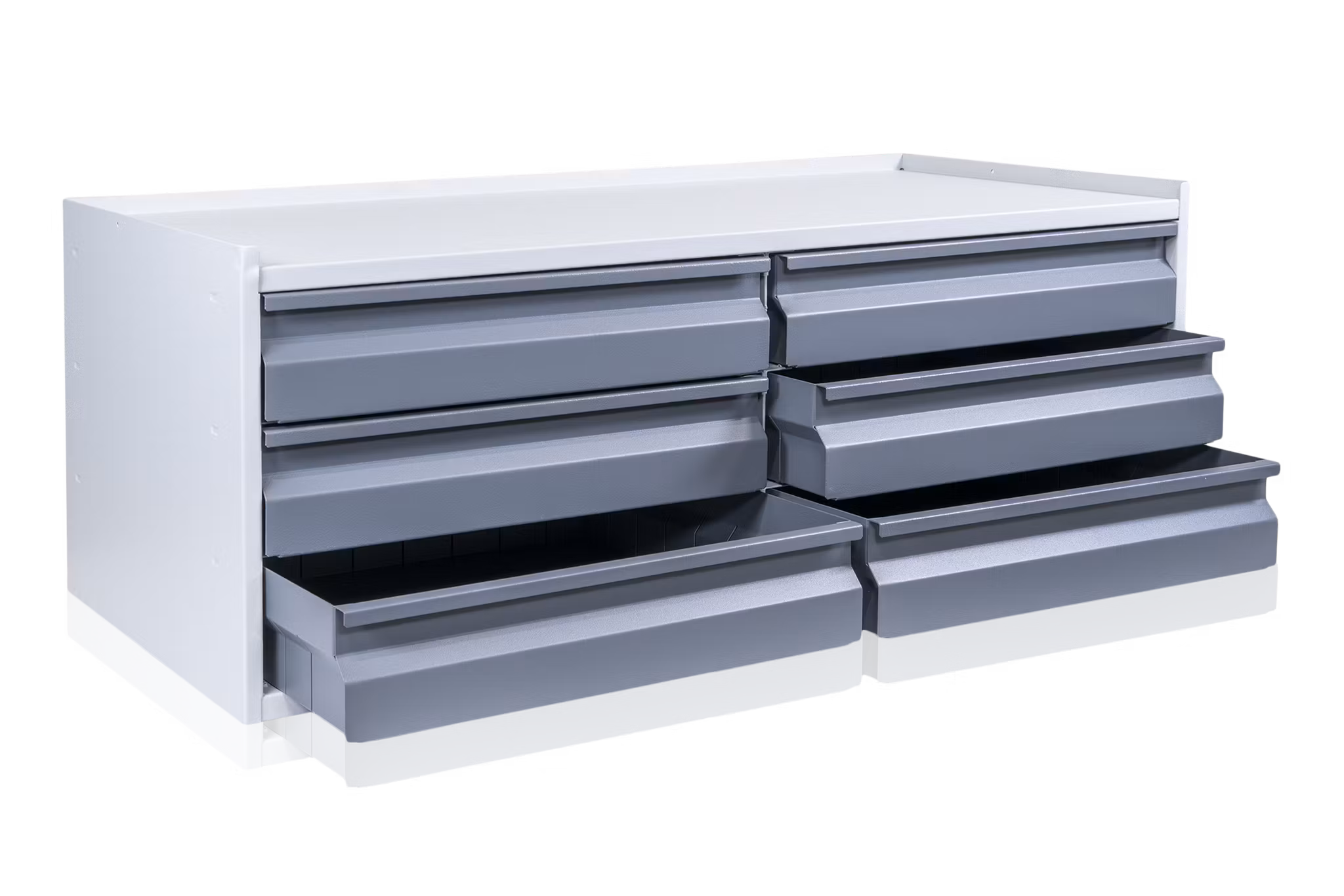 Lådinsats för verkstadsskåp. Placeras på hyllplan. Bestående av 6 stycken lådor med slitsade insidor. Levereras exklusive mellanväggar och avdelare.