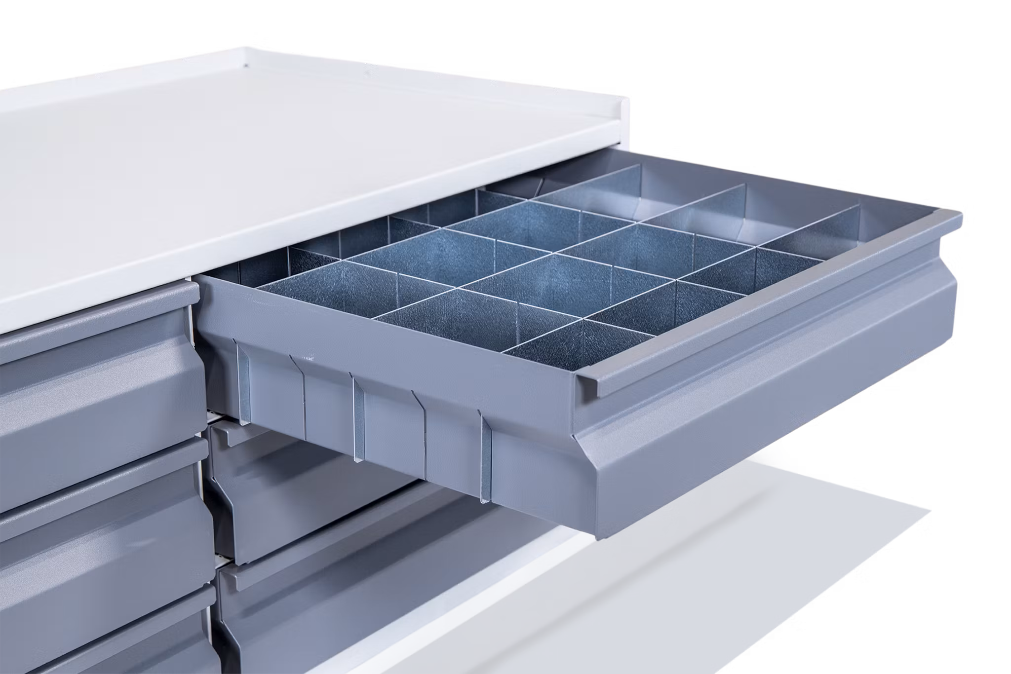 Inredning för låda i lådinsats. 3 stycken slitsade längsgående mellanväggar samt 3 stycken slitsade avdelare.
