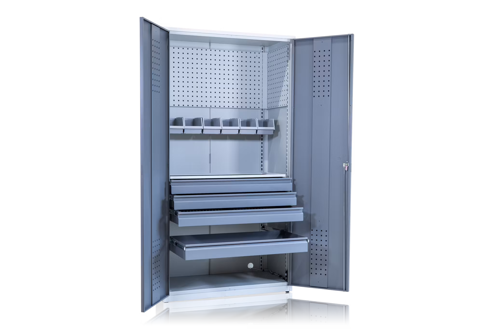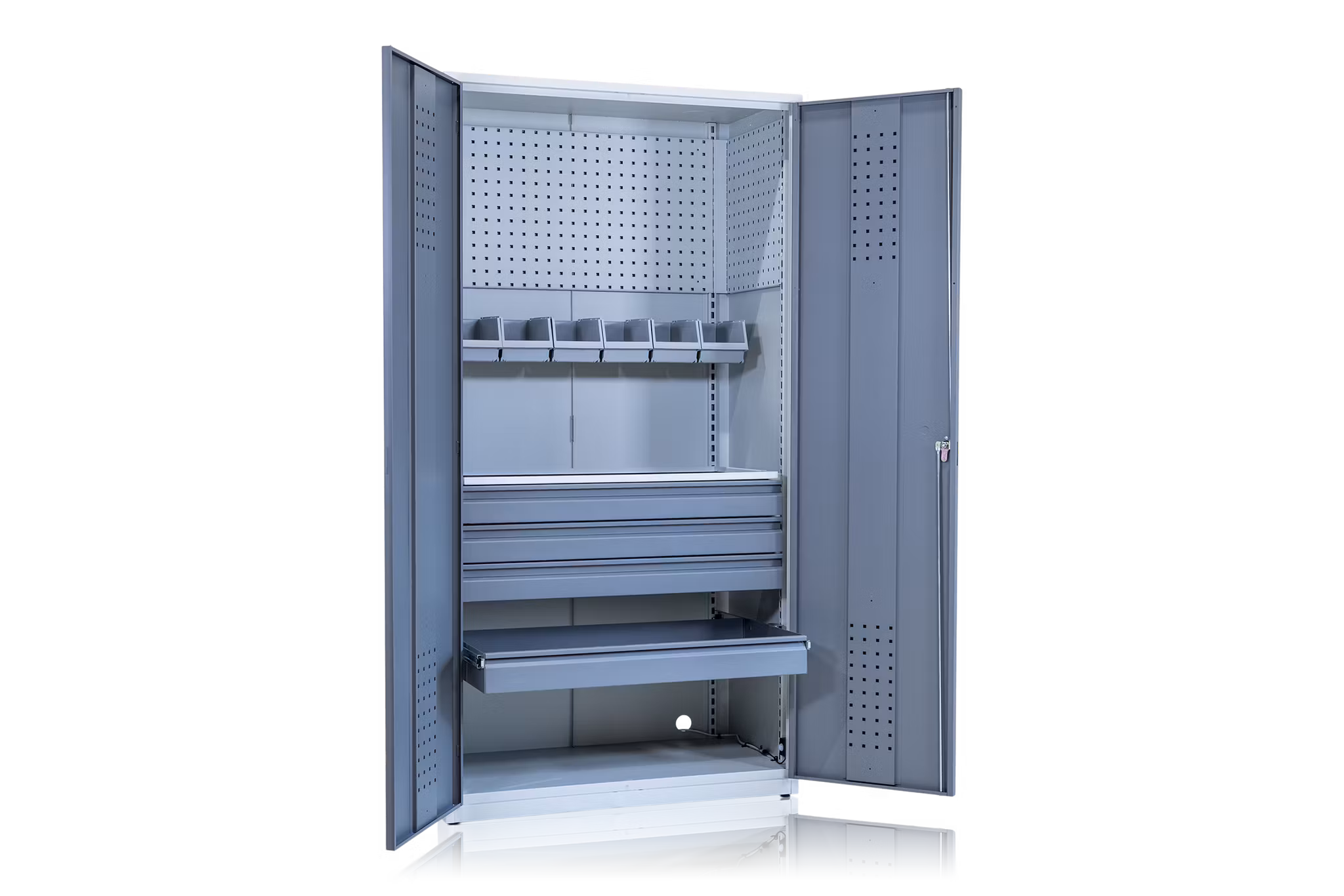 Ett robust verkstadsskåp tillverkat i en helsvetsad konstruktion av stålplåt. Passar för krävande miljöer som verkstäder och lager men lämpar sig även som kontors- eller arkivskåp.