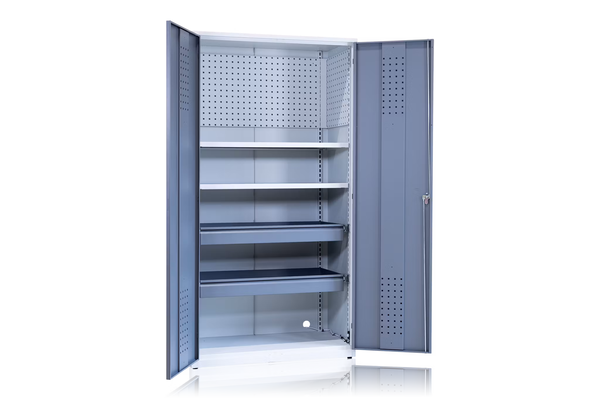 Ett robust verkstadsskåp tillverkat i en helsvetsad konstruktion av stålplåt. Passar för krävande miljöer som verkstäder och lager men lämpar sig även som kontors- eller arkivskåp.