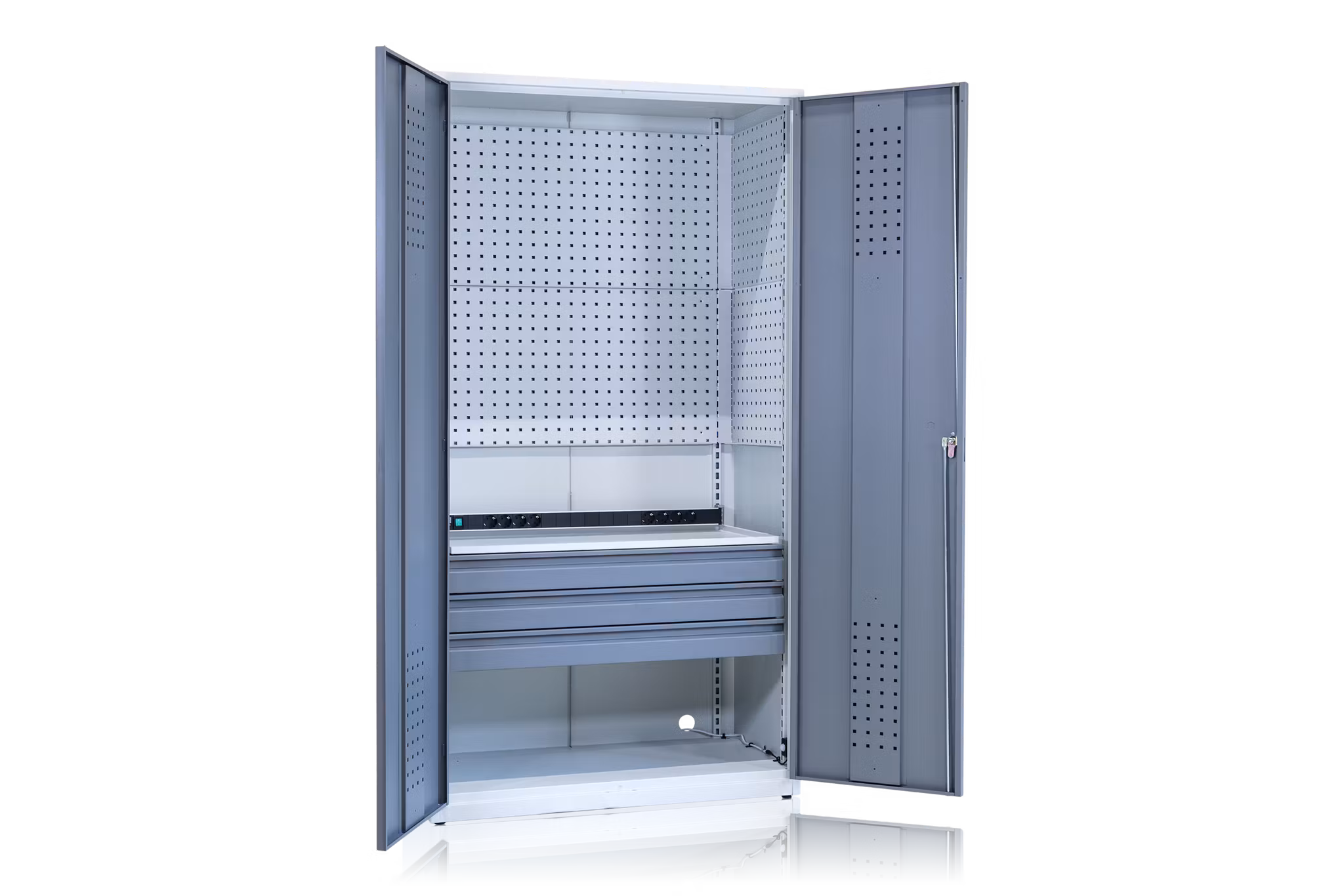 Ett robust verkstadsskåp tillverkat i en helsvetsad konstruktion av stålplåt. Passar för krävande miljöer som verkstäder och lager.