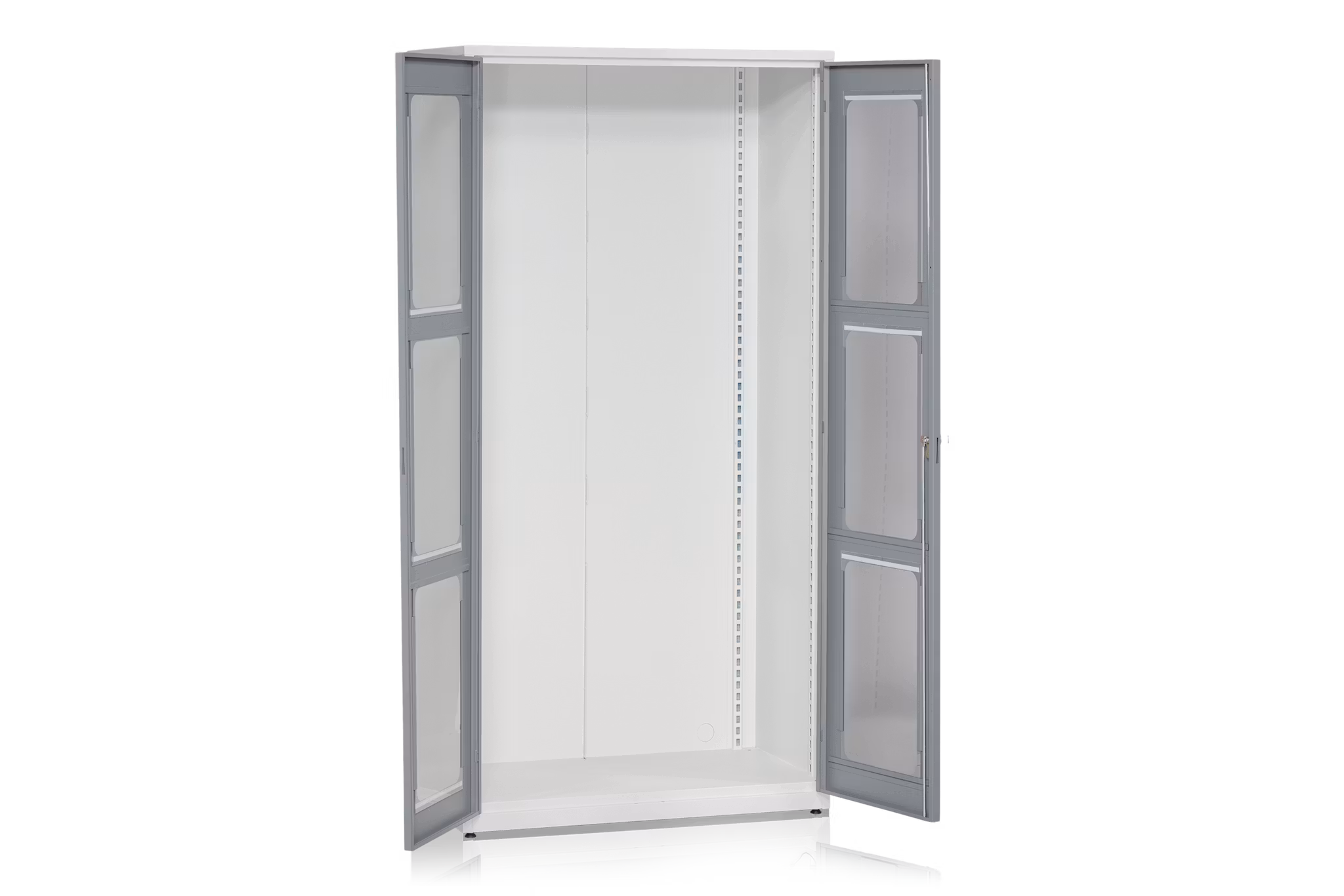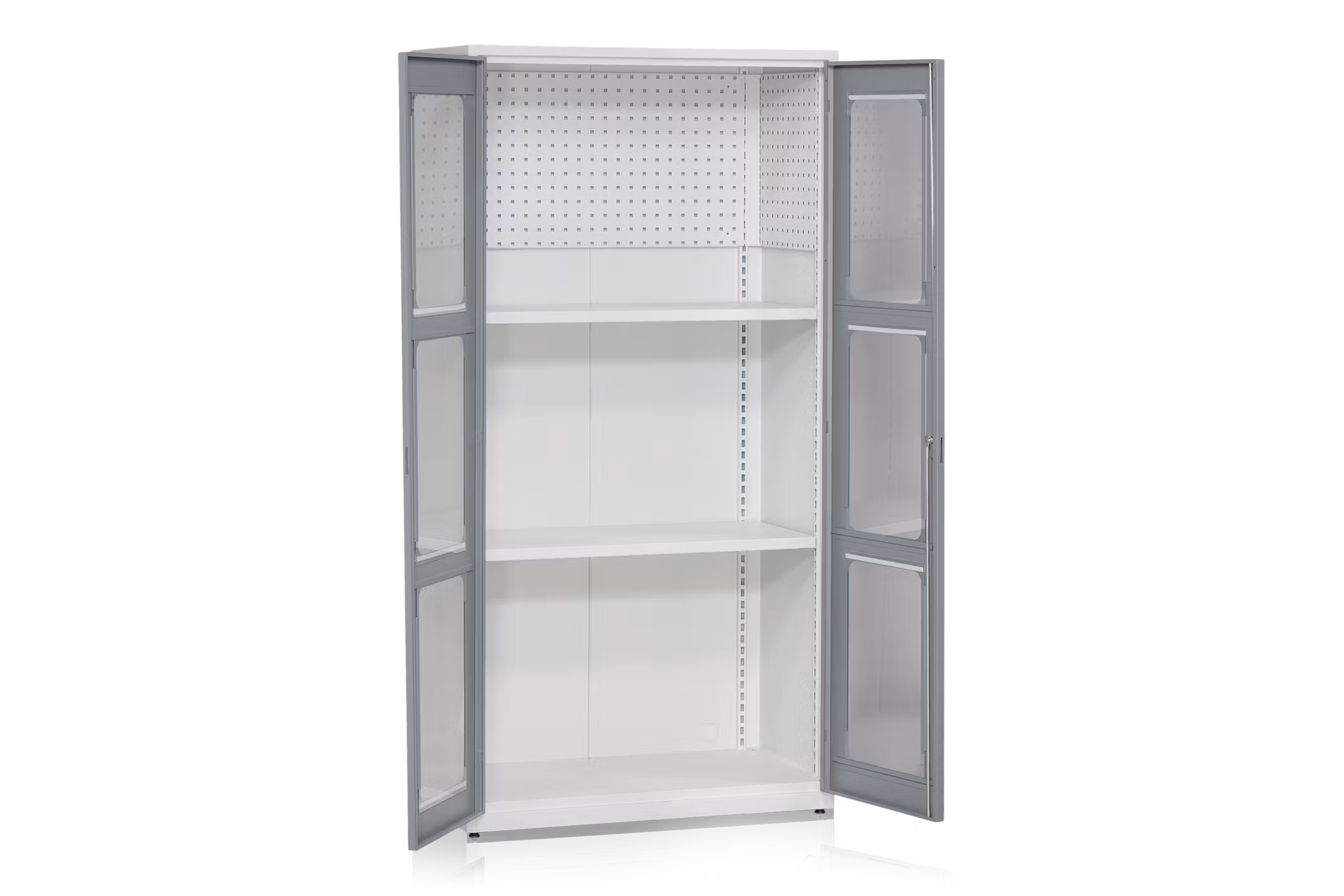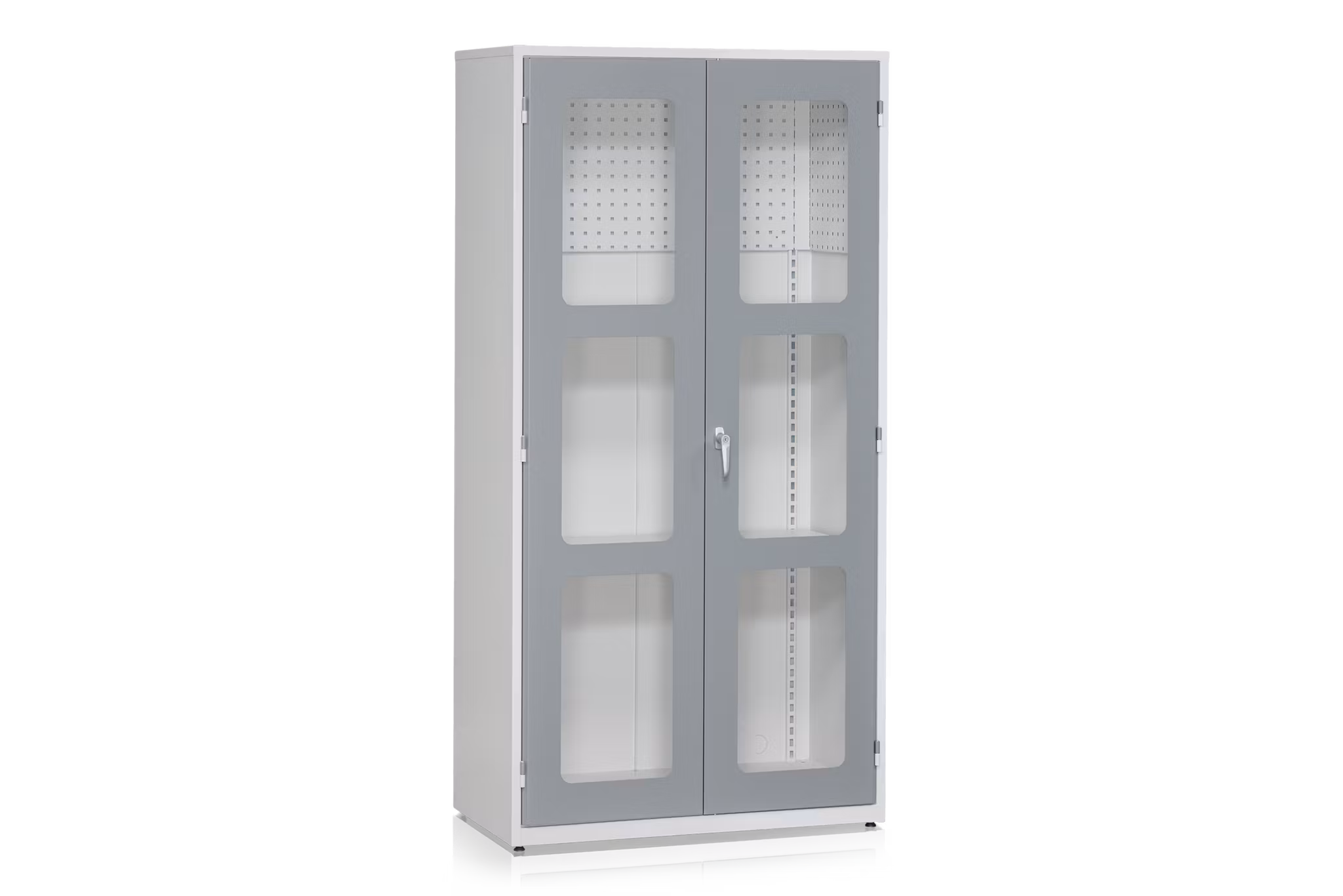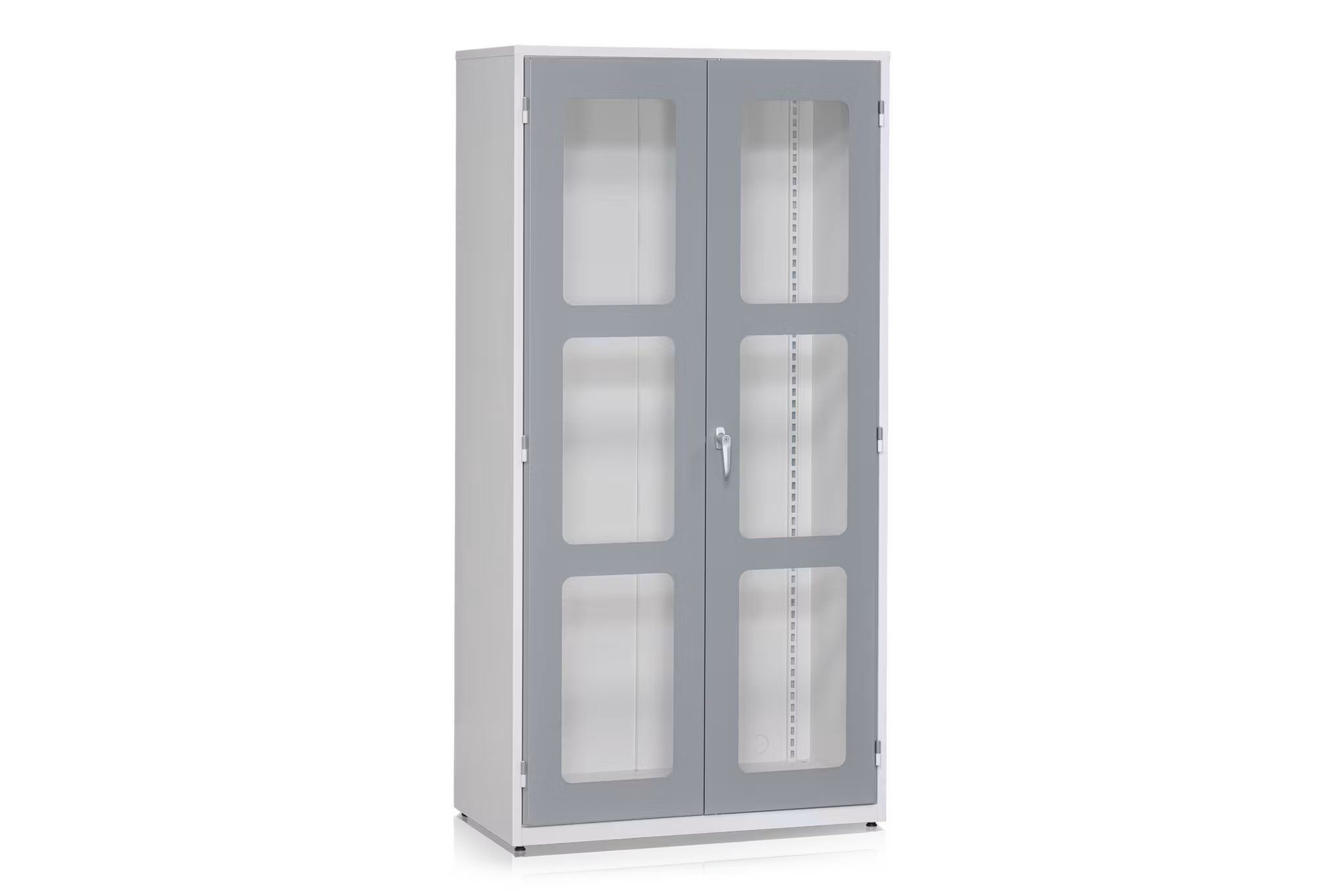 Verkstadsskåp tillverkat i en helsvetsad konstruktion av stålplåt och utrustat med plexiglasdörrar. Passar för krävande miljöer som verkstäder och lager men lämpar sig även som kontors- eller arkivskåp.