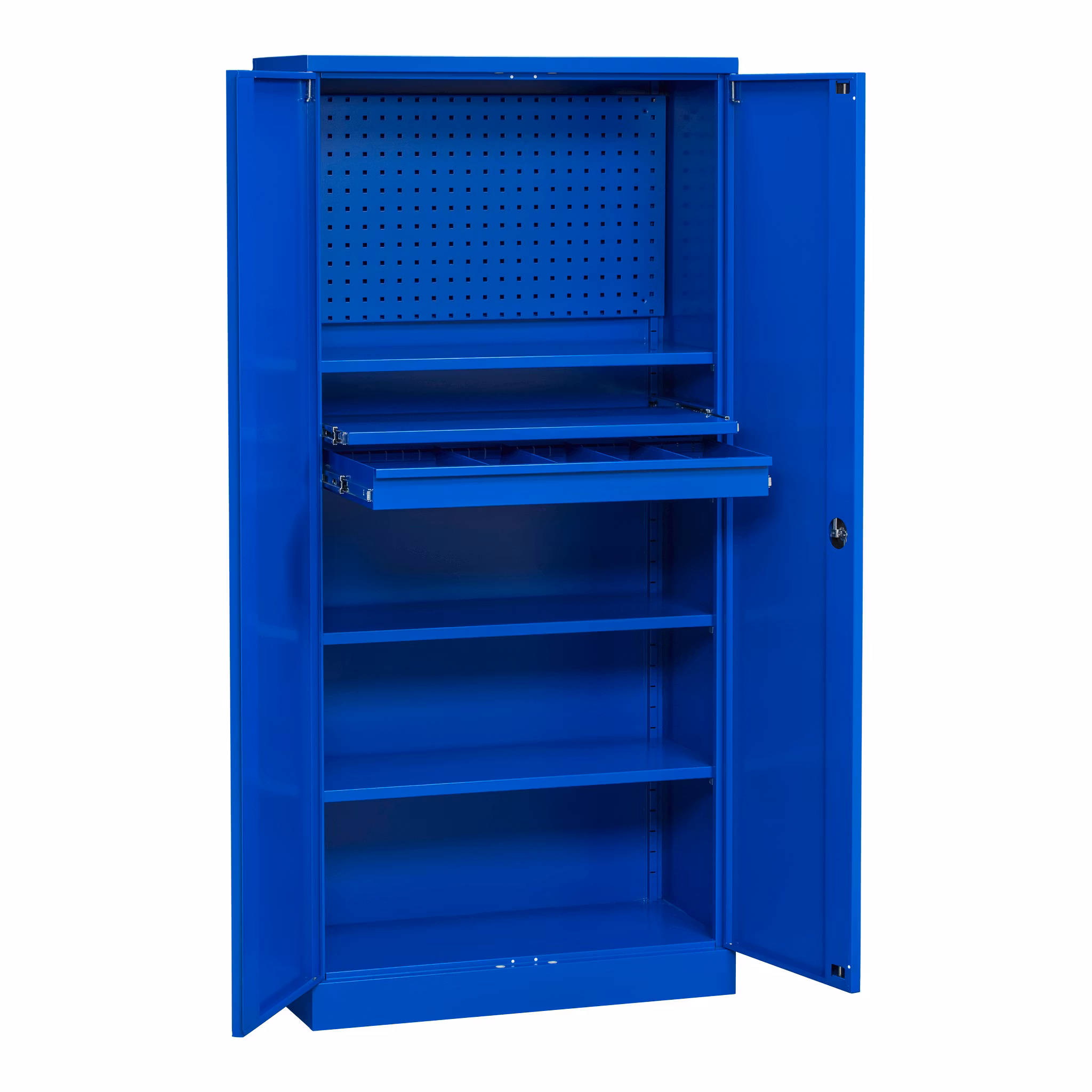 Ett robust verkstadsskåp tillverkat i en helsvetsad konstruktion av stålplåt. Passar för krävande miljöer såsom verkstäder och lager men det lämpar sig även som kontors- eller arkivskåp. Skåpet är utrustat med justerbara fötter så att det står stadigt även på ojämna underlag.