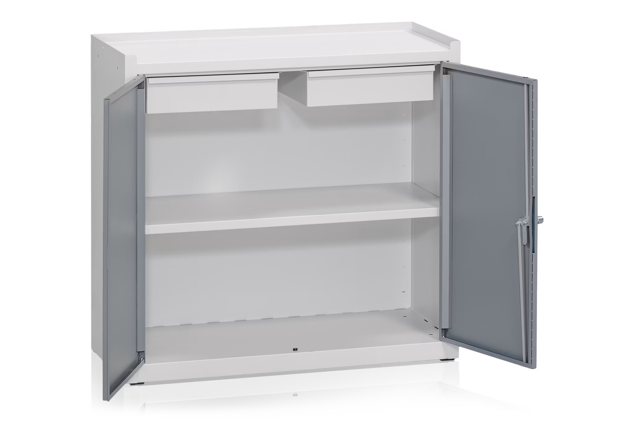 Verkstadsskåp i plåt, helsvetsad konstruktion. Innehåller ett flyttbart hyllplan samt två utdragbara låda högst upp i skåpet. Avlastningsplan med raskant på ovansida. Stommen färgad ljusgrå och dörren mörkgrå.
