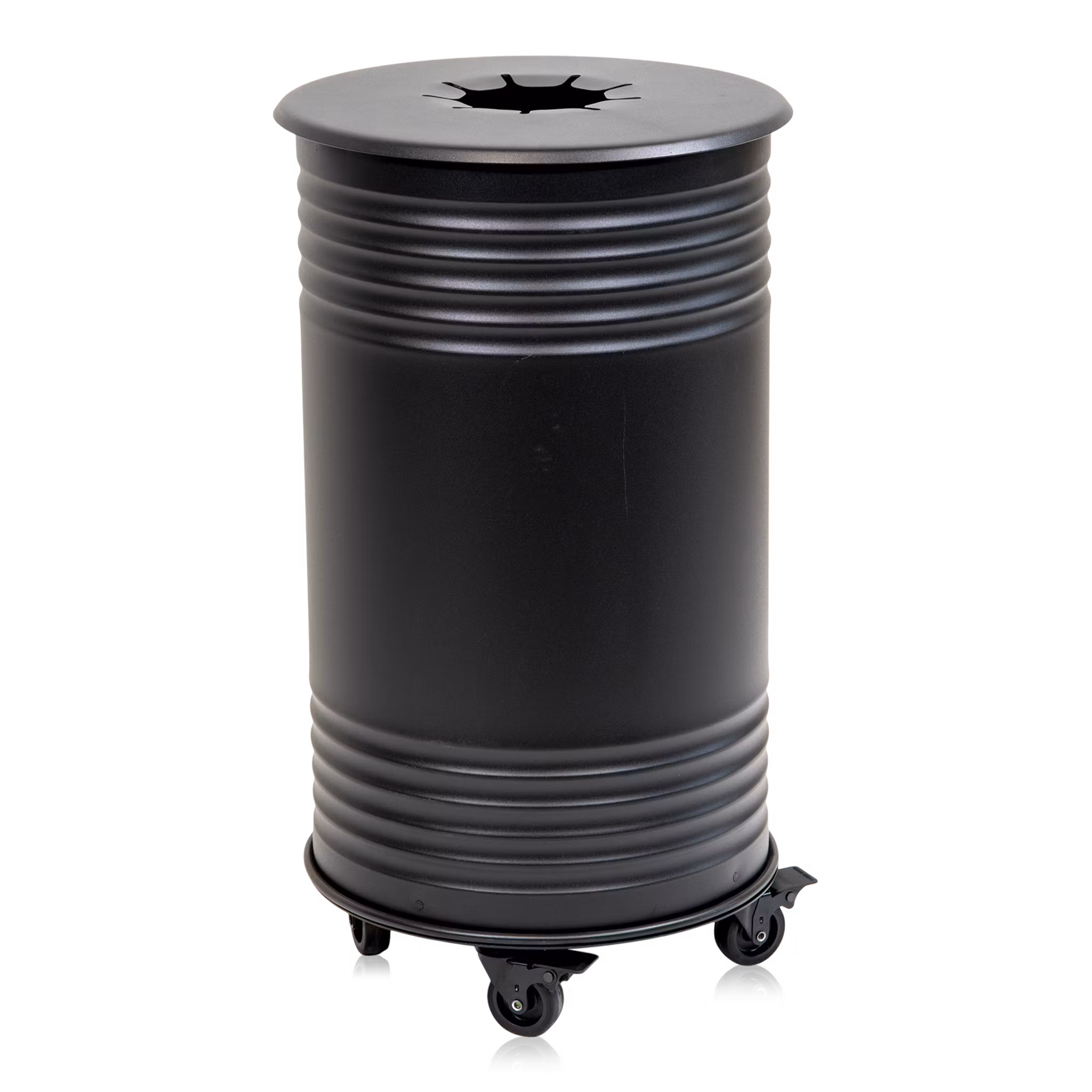 Sortera mera med vår avfallsbehållare i plåt! Tunnan är placerad på en bottenplatta med tre hjul och har en ringinsats för placering av avfallspåsen inuti avfallsbehållaren, vilket är både funktionellt för den som tömmer och skapar ett mer stilrent uttryck på arbetsplatsen.