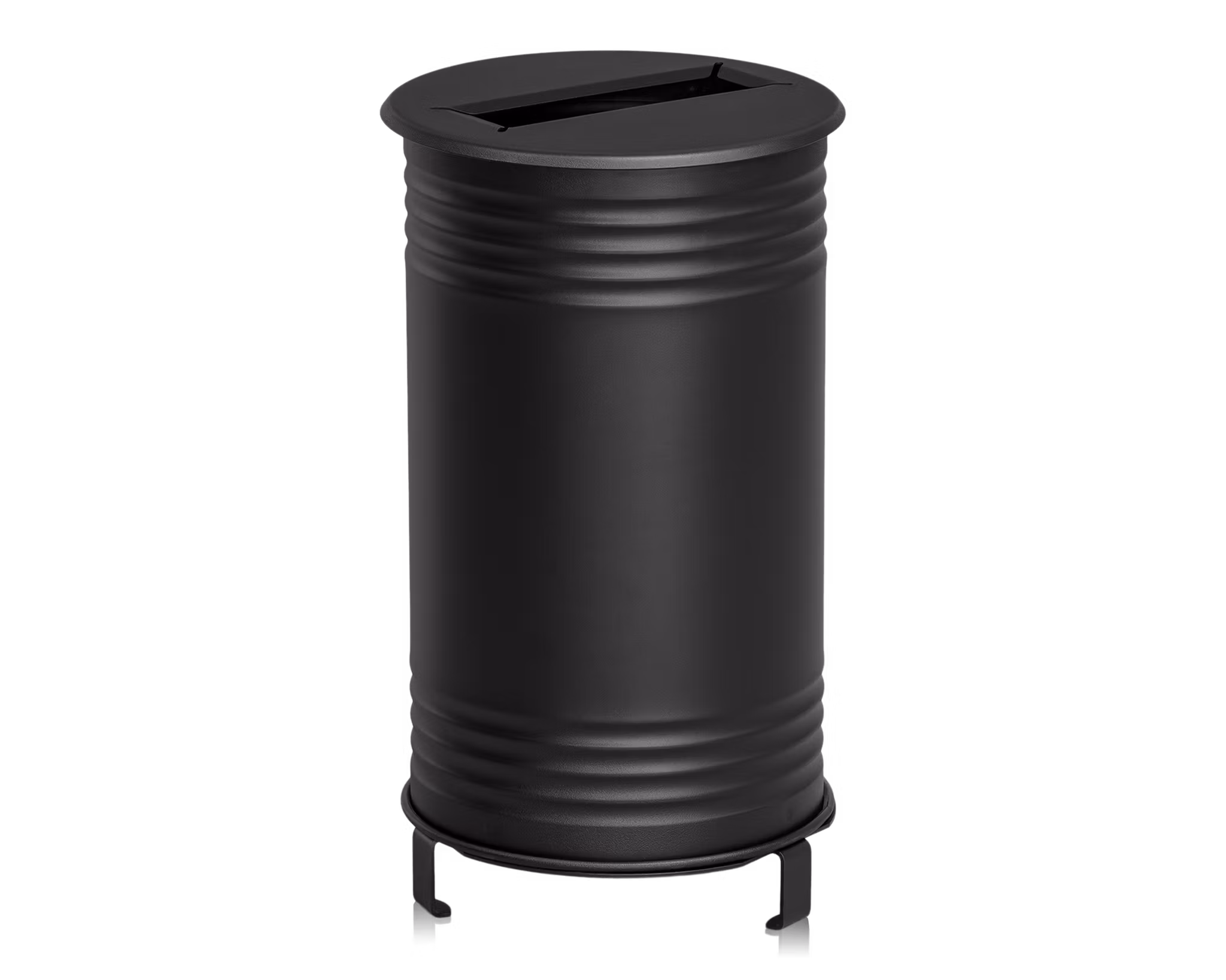 Sortera mera med vår avfallsbehållare i plåt! Tunnan är placerad på tre ben och har en ringinsats för placering av avfallspåsen inuti avfallsbehållaren, vilket är både funktionellt för den som tömmer och skapar ett mer stilrent uttryck på arbetsplatsen.