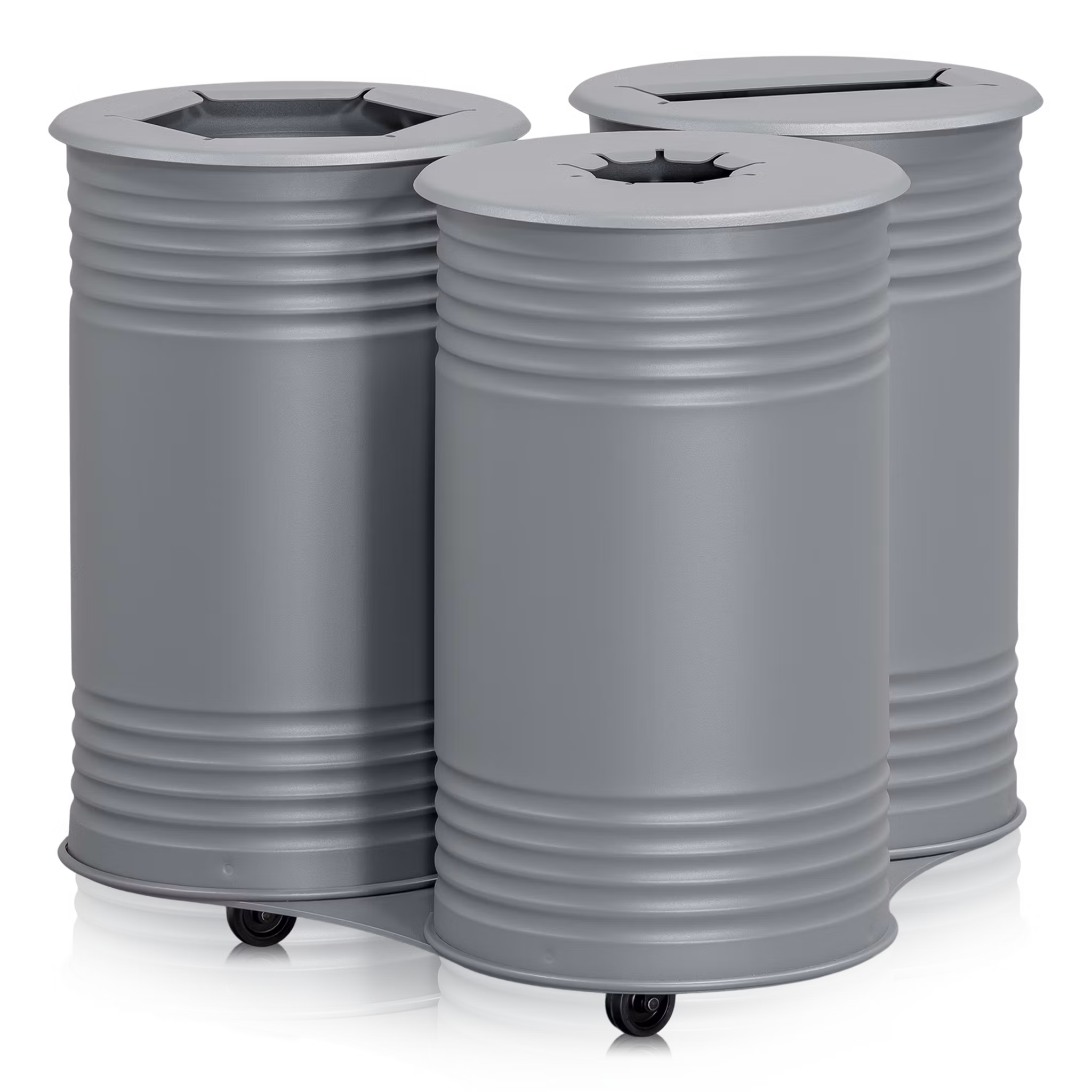 Sortera mera med vår avfallsbehållare i plåt! De tre tunnorna är placerade på en bottenplatta med låsbara hjul och har en ringinsats för placering av avfallspåsen inuti avfallsbehållaren, vilket är både funktionellt för den som tömmer och skapar ett mer stilrent uttryck på arbetsplatsen.
