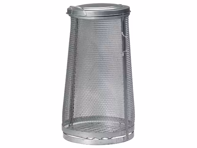 Säckhållare i galvaniserad plåt med skyddande sträckmetall mot fåglar och andra djur. Klämring för plast- eller papperssopsäck. Övre/undre diameter 465/540 mm.