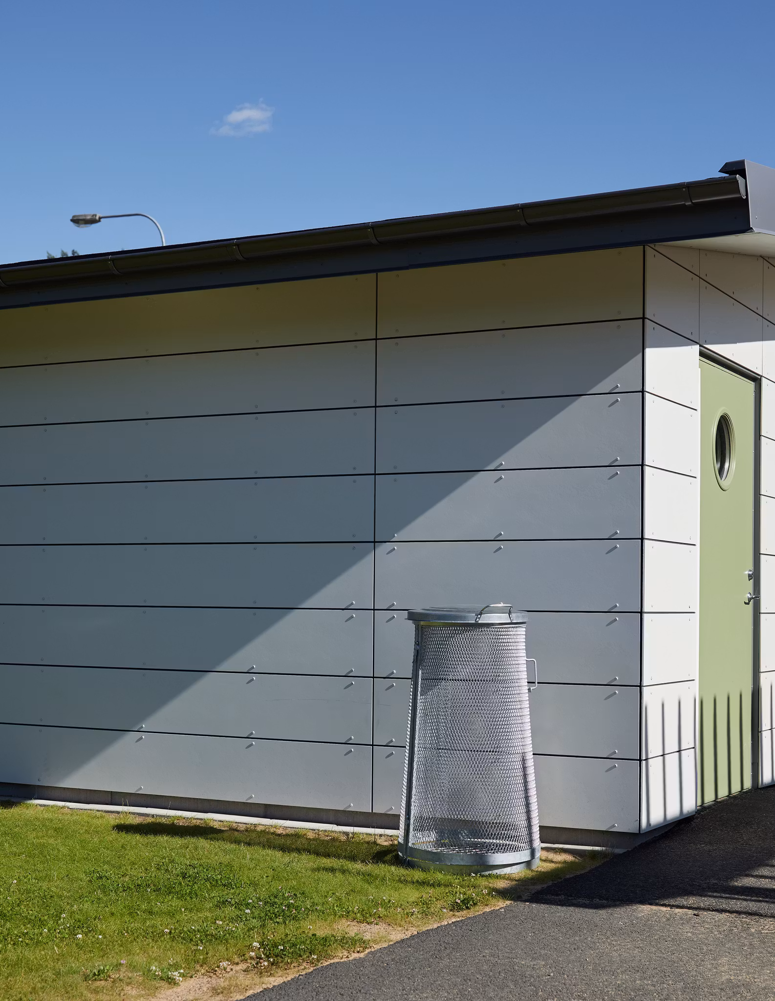 Säckhållare i galvaniserad plåt med skyddande sträckmetall mot fåglar och andra djur.