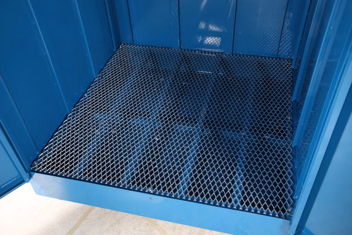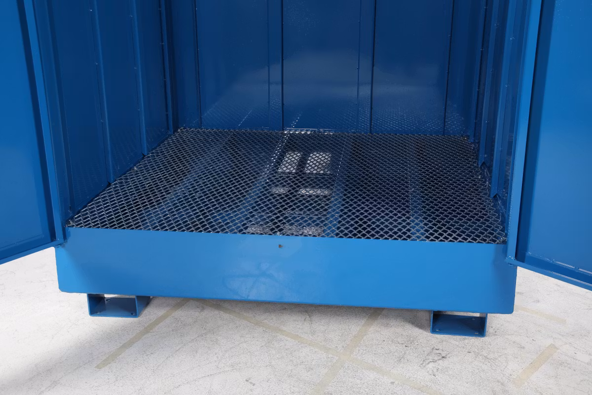 Fatpall för fyra stående fat med låsbart heltäckande stålhölje. Hanteras med handtruck, staplare eller gaffeltruck. Passar för fyra fat.