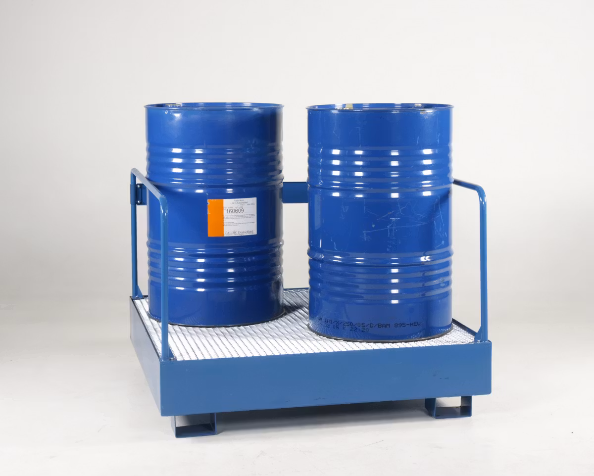 Fatpall för 4 stående fat med skyddsräcke och integrerat uppsamlingskärl. Robust stålkonstruktion för säker och spillfri lagring.