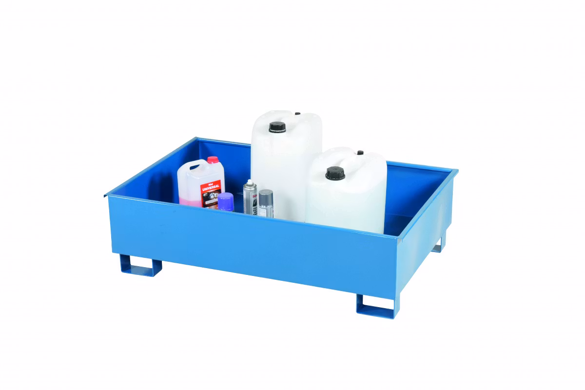Spillbassäng för säker lagring och förvaring av kemikalier i fat, dunkar, flaskor m.m. Fungerar även att placera reserv- och maskindelar i vid service på maskiner och fordon. Hanteras med handtruck, staplare eller gaffeltruck.