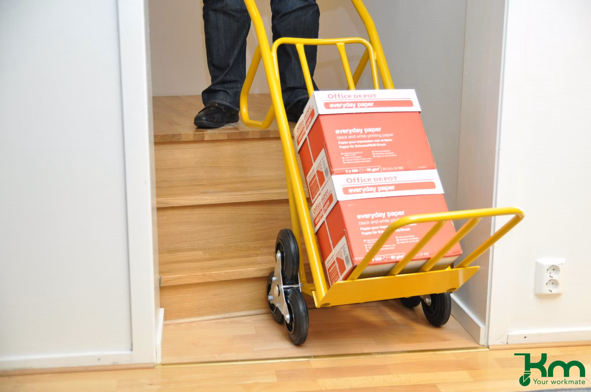 Kraftig kärra som är anpassad för trappor. Gör det otroligt enkelt att flytta gods i båda riktningar. Fällbart lastplan.