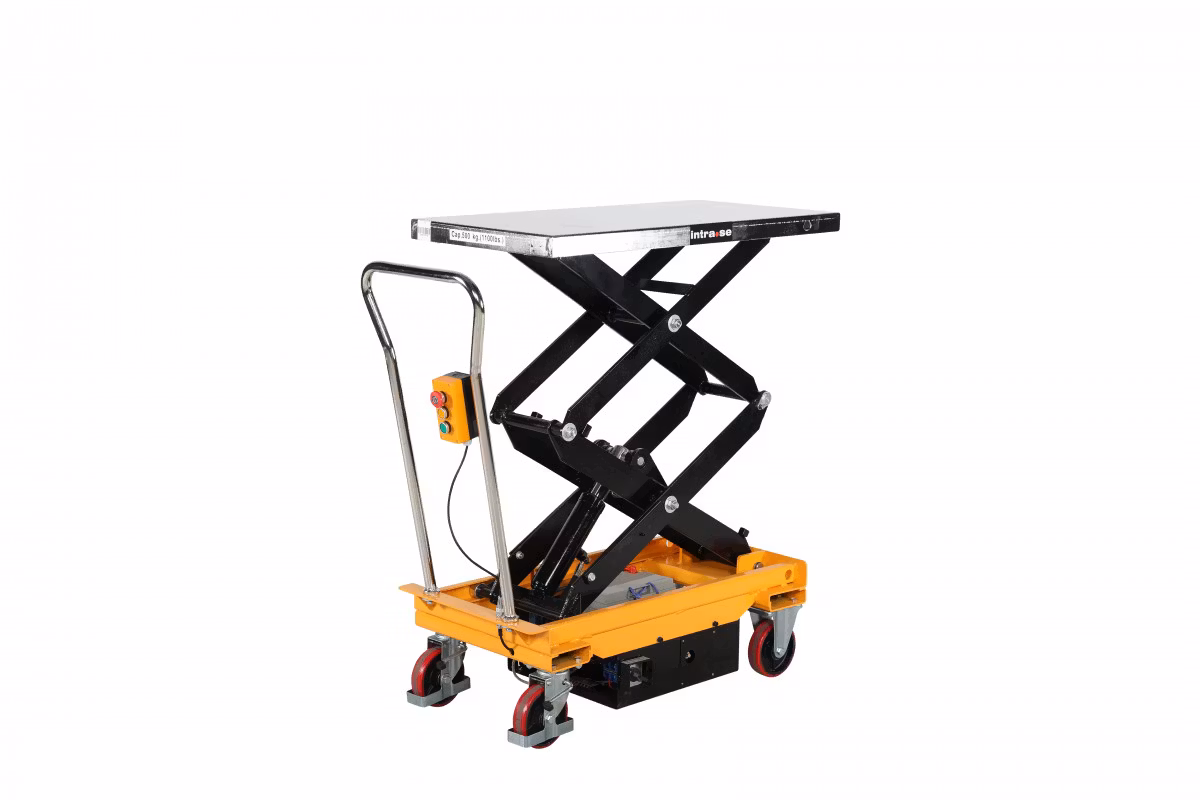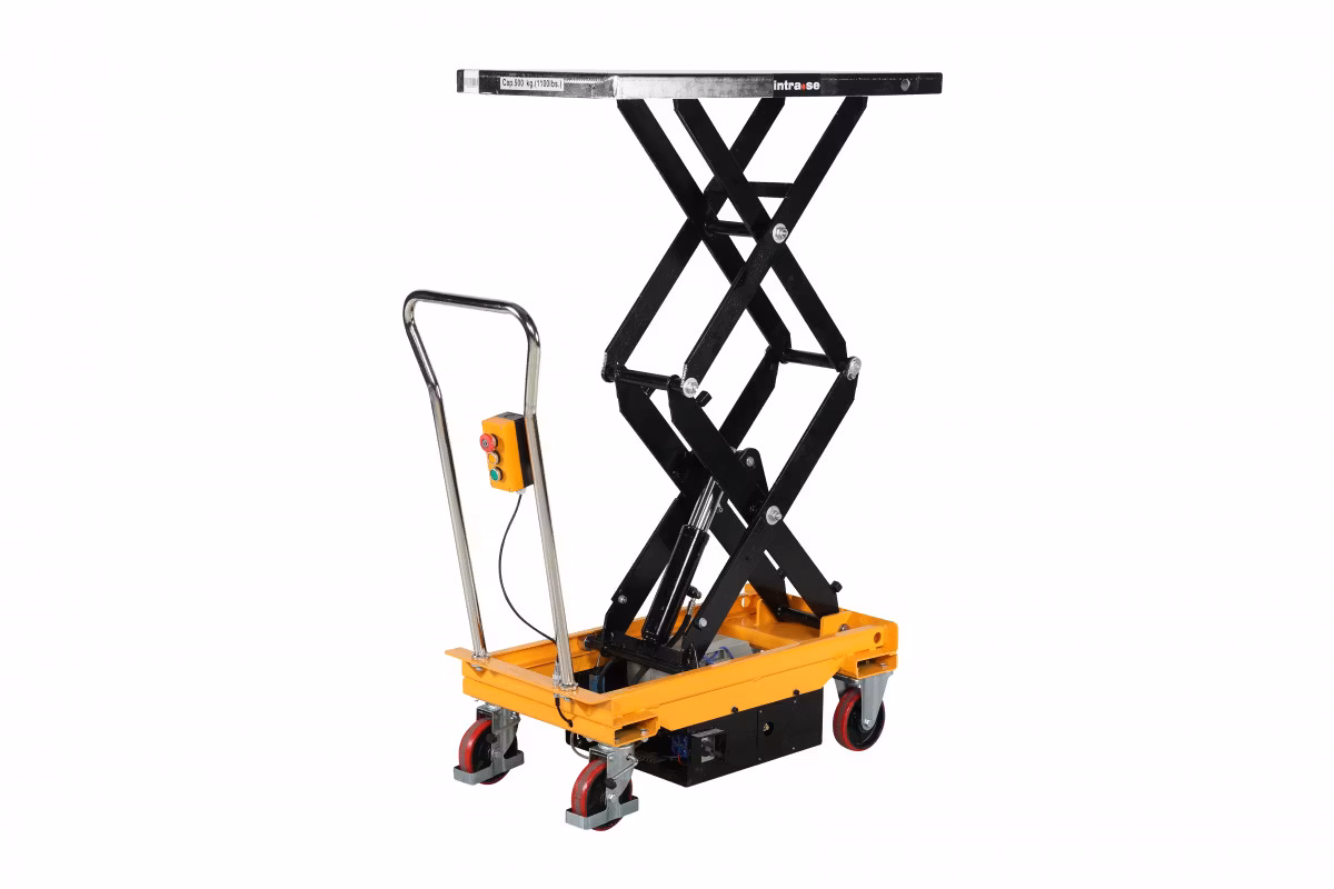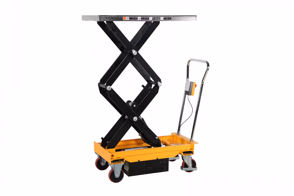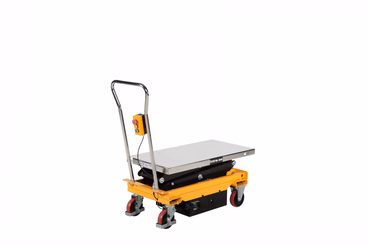 Elektrisk lyftbordsvagn 500 kg med justerbar lyfthöjd, 700 W motor och robust lastplatta i kromat stål. Smidig och säker hantering i industri och verkstad.