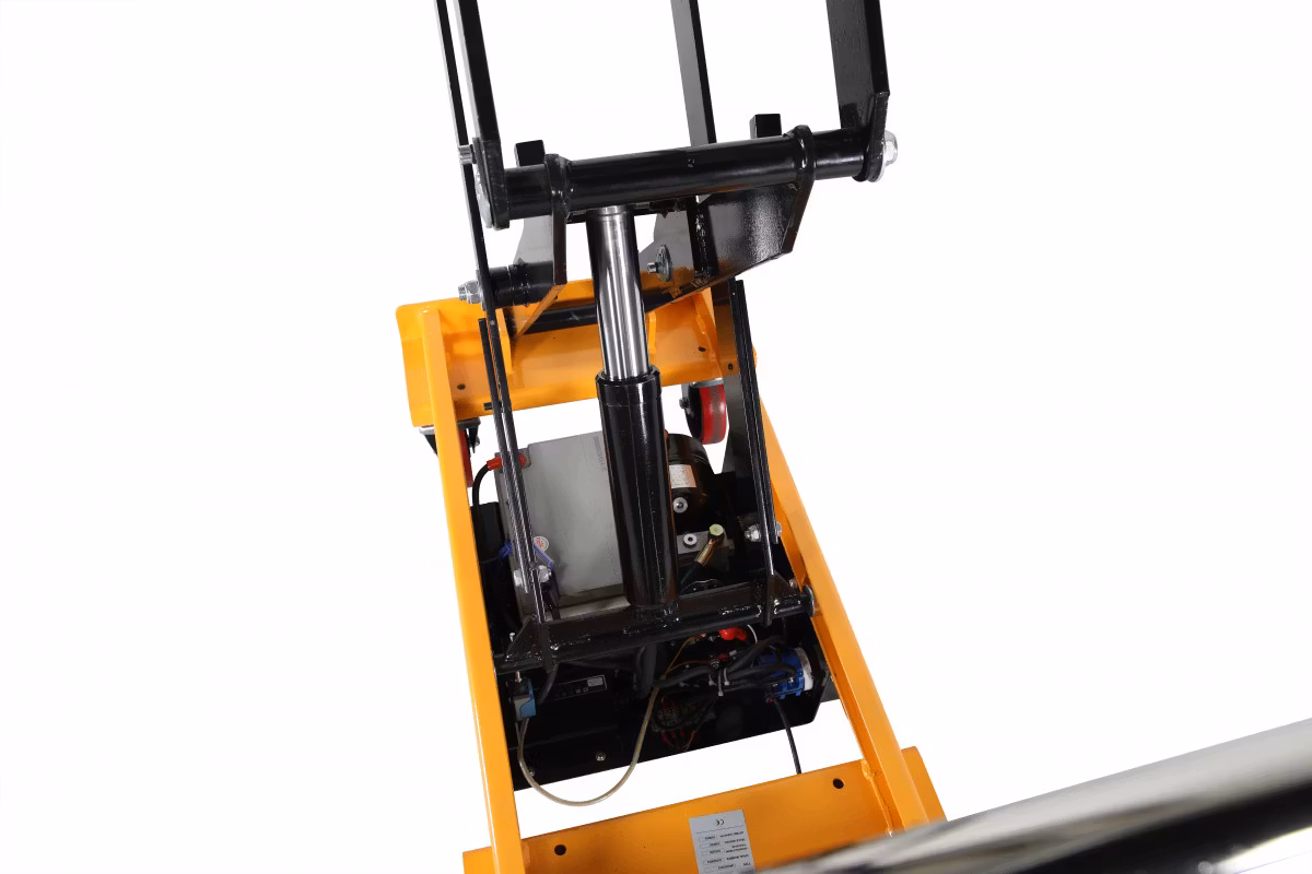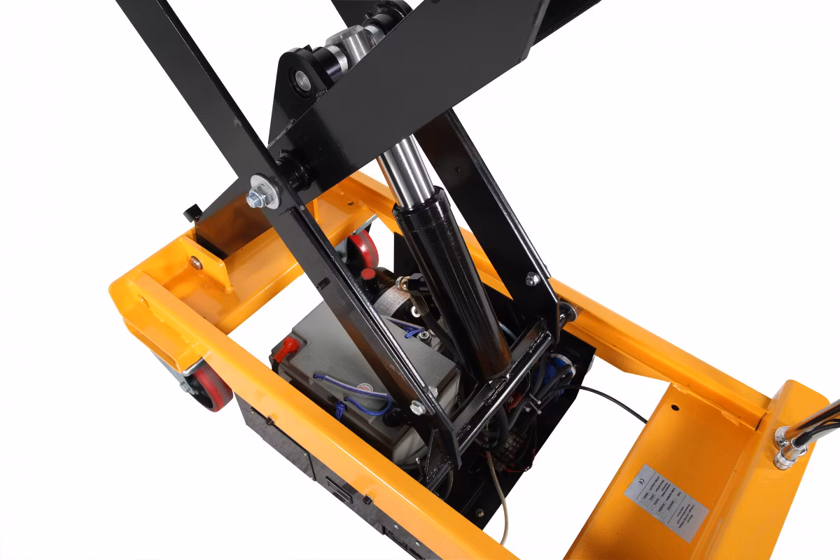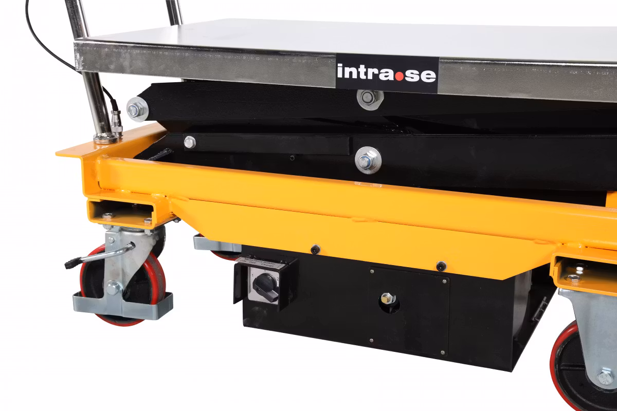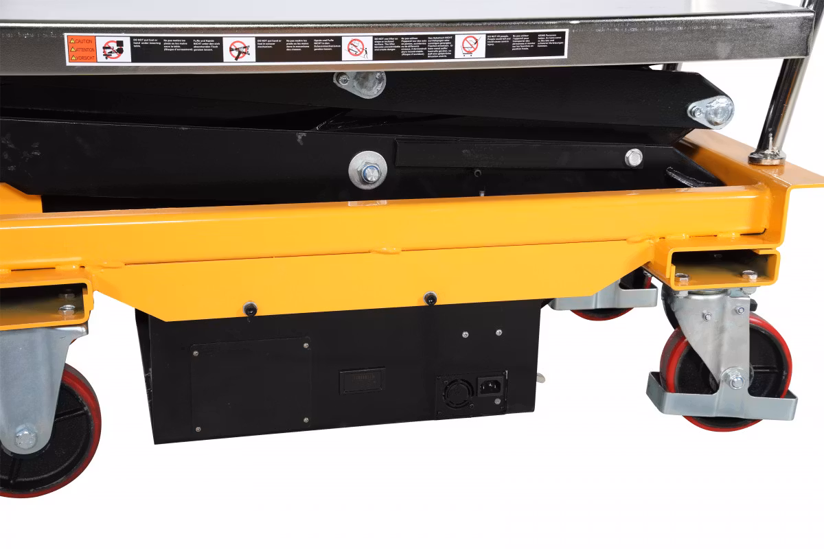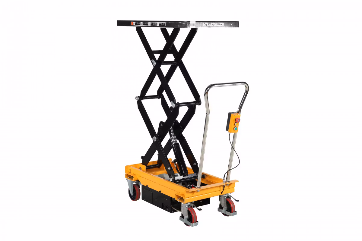 Elektrisk lyftbordsvagn 500 kg med justerbar lyfthöjd, 700 W motor och robust lastplatta i kromat stål. Smidig och säker hantering i industri och verkstad.