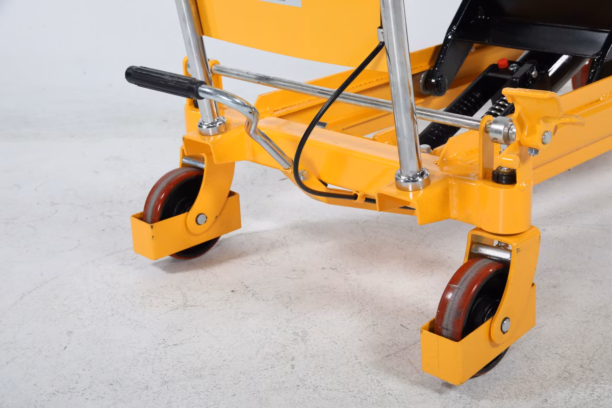 Hydraulisk lyftbordsvagn med dubbelsax. Försedd med quicklift. Höjning justeras med fotpump och sänkning med handreglage. 2 styck fasta och 2 styck länkhjul. Fotskydd på länkhjulen.