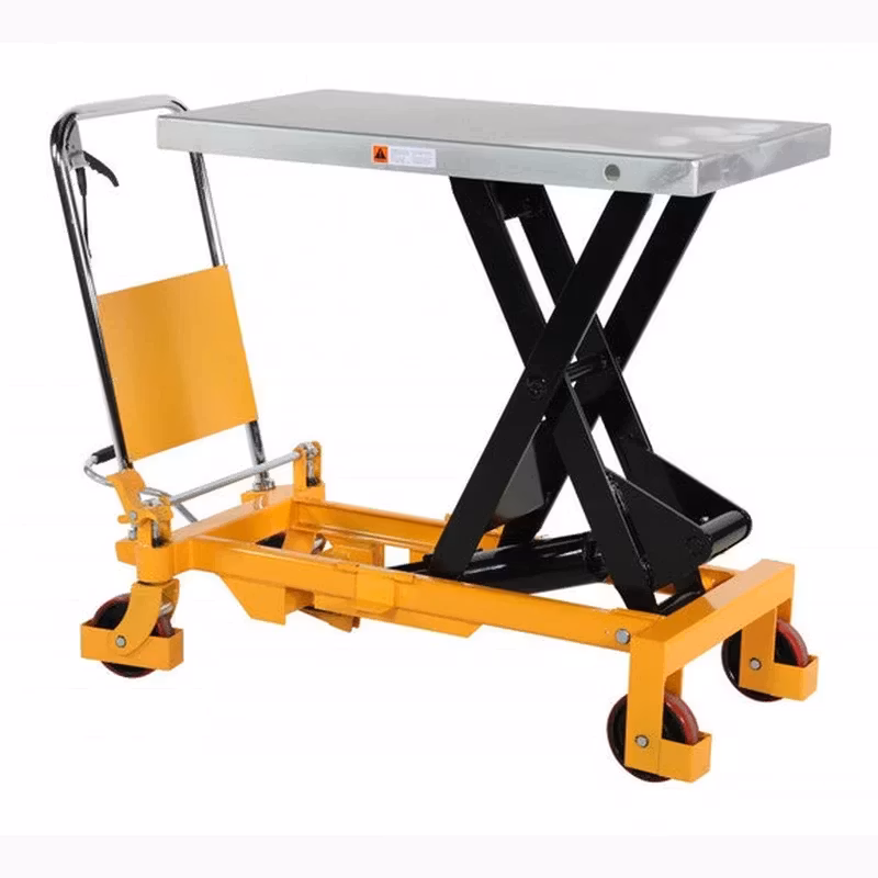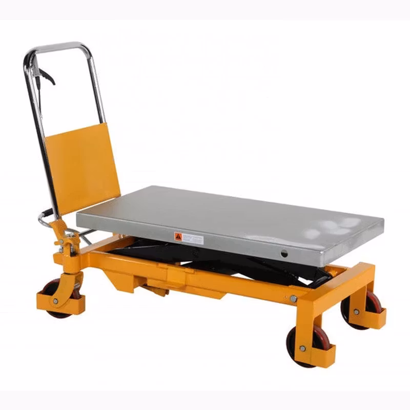 Hydraulisk lyftbordsvagn. Höjning justeras enkelt med fotpump och sänkning med handreglage. 2 styck fasta och 2 styck länkhjul. Fotskydd på länkhjulen.