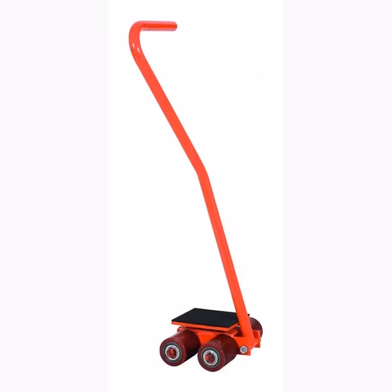 Maskintransportör 4 ton med dragstång. Gummiklädd och roterande lastyta, slitstarka polyuretanhjul och robust stålkonstruktion för säker maskinflytt.