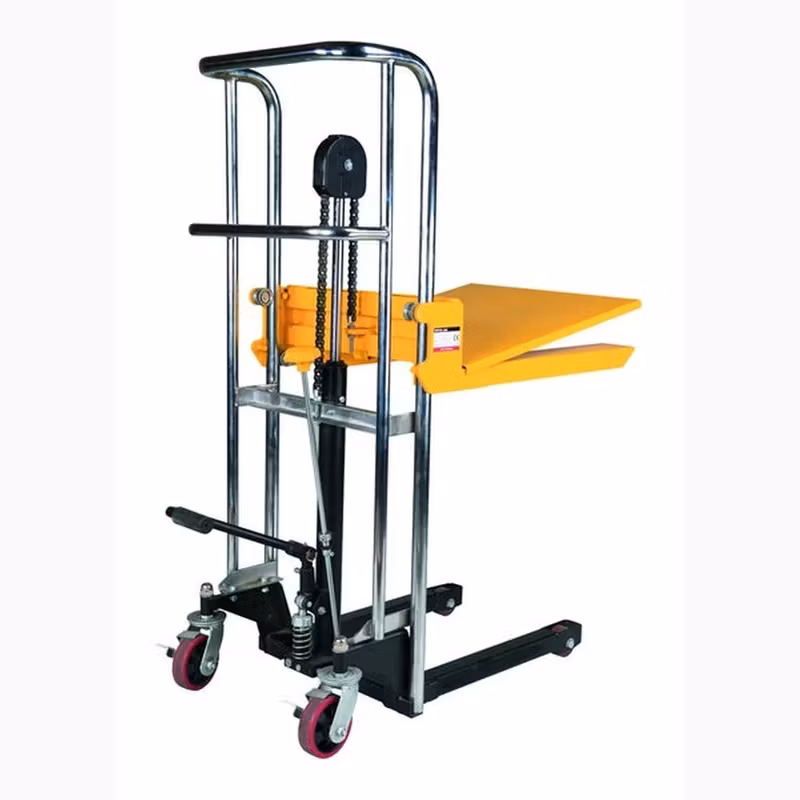 Hydraulisk staplare och mobilt lyftbord, utrustad med både gafflar och löstagbar plattform. Manuell staplare med fällbar pumpstång för lyft och manuellt handtag för sänkning.