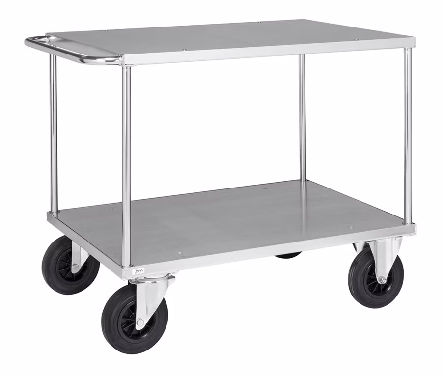 Snygg och smidig bordsvagn. Finns i flera storlekar och med eller utan broms. Serien innehåller plattformsvagn, bordsvagn, gavelvagn, lådvagn och skivvagn.