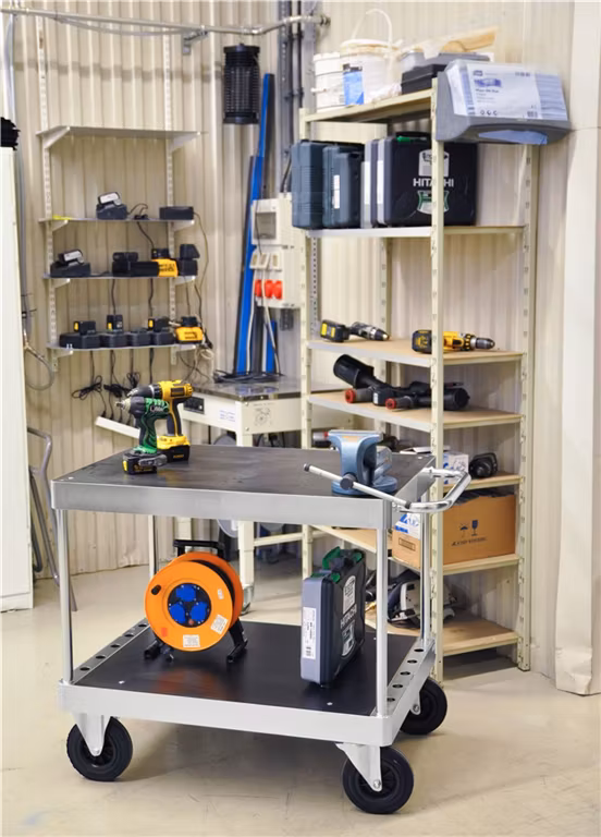 Elförzinkad vagn med MDF skiva. Tekniska data: Längd: 1335 mm, Bredd: 800 mm, Höjd: 920 mm, Vikt: 63,5 kg, Höjd till handtag: 885 mm, Maxlast: 800 kg
