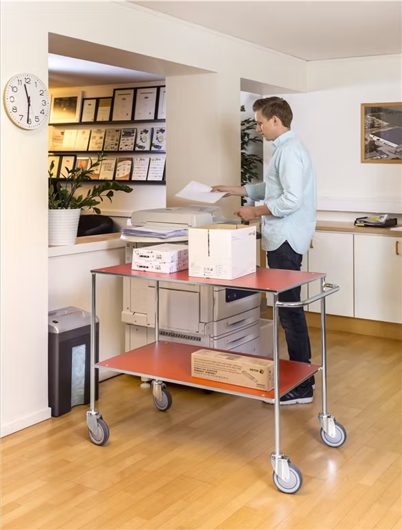 Elförzinkad med laminatskiva. 2 hyllplan. Hjuldiameter: 125 mm.