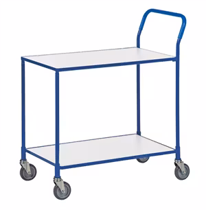 Pulverlackerad med laminatskiva. Greppvänligt, plastat handtag. 2 hyllplan. Avstånd mellan hyllplan: 510 mm. Maxlast hyllplan: 50 kg. Hjul: 4 länk. Hjuldiameter: 100 mm.