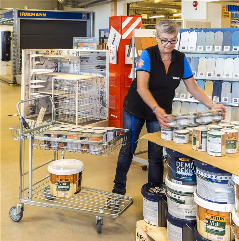 Stackningsbar butik/lagervagn med korg som går att fälla upp. Finns i 4 modeller. Levereras omonterad. Belstning övre hyllplan 100 kg. Invändigt mått på korg 695 x 328 x 125 mm.