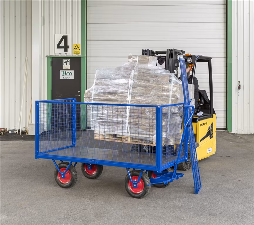 Flakvagn i mycket kraftig konstruktion. Med hjälp av handtaget så bromsar man enkelt vagnen, flera olika tillbehör kan erbjudas.