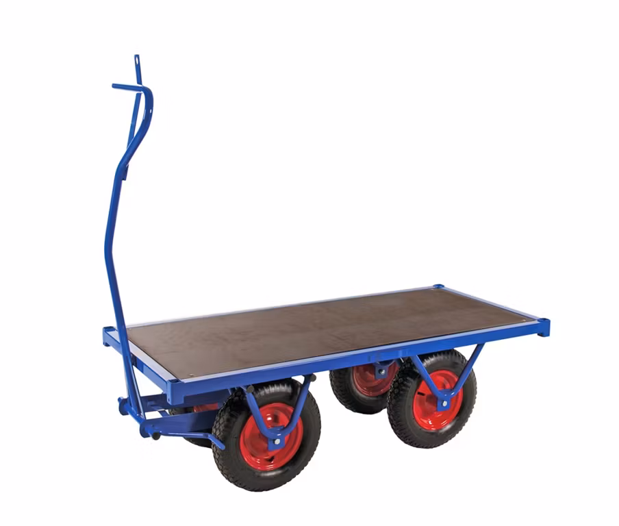 Flakvagn i mycket kraftig konstruktion. Med hjälp av handtaget så bromsar man enkelt vagnen, flera olika tillbehör kan erbjudas. Finns som standard i 5 modeller.