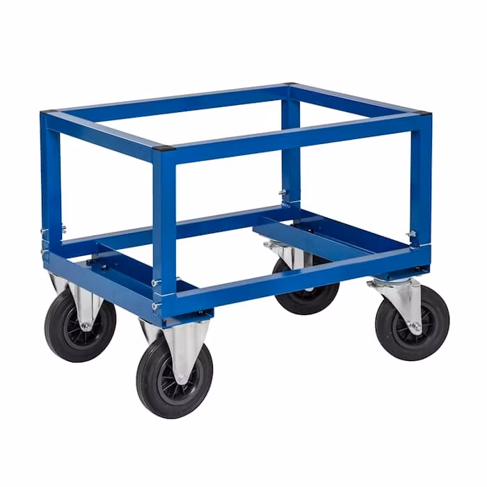 Pulverlackerad. Anpassad för halvpall 800 x 600 mm. Ställbar i höjd. Hjul: 2 fast 2 länk. Hjuldiameter: 200 mm.