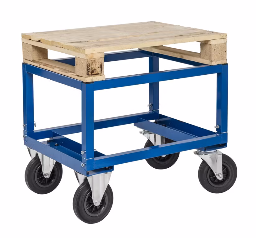 Pulverlackerad. Anpassad för halvpall 800 x 600 mm. Ställbar i höjd. Hjul: 2 fast 2 länk.