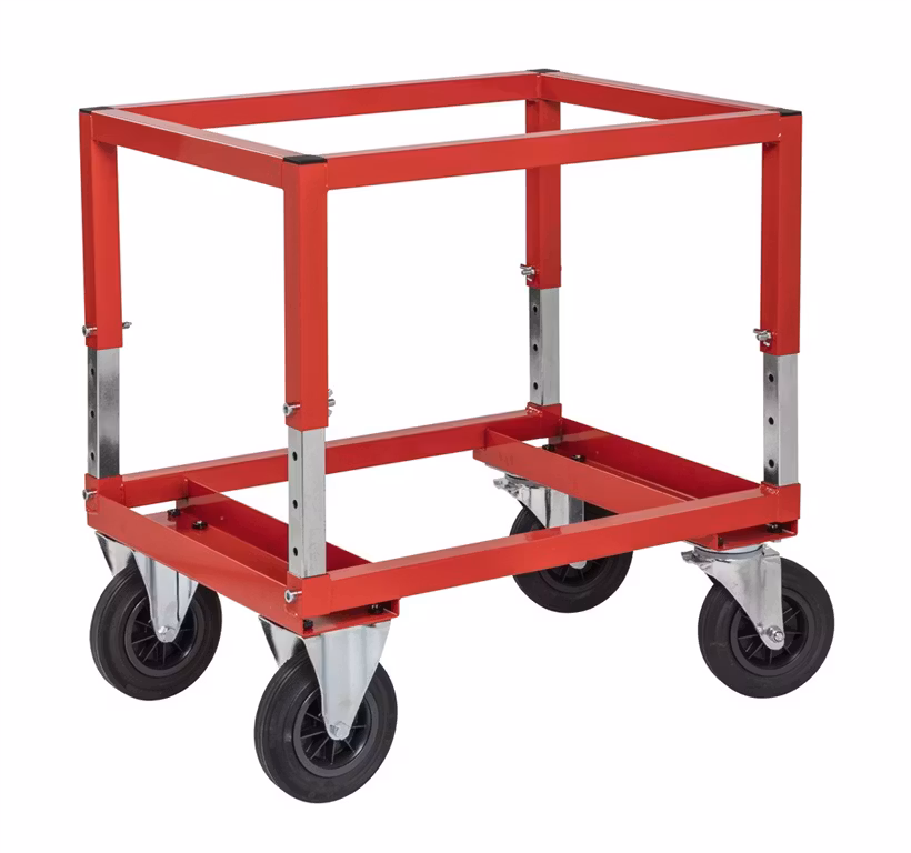 Pulverlackerad. Anpassad för halvpall 800 x 600 mm. Ställbar i höjd. Hjul: 2 fast 2 länk. Hjuldiameter: 200 mm.