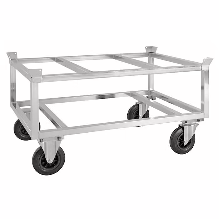 Anpassad för EUR pall 1200 x 800 mm. Hjul: 2 fast 2 länk. Hjuldiameter: 200 mm.