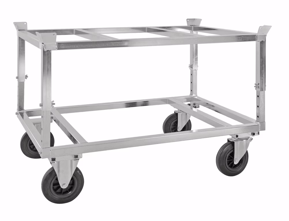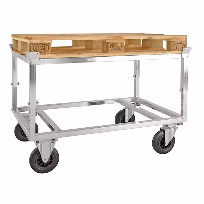 Anpassad för EUR pall 1200 x 800 mm. Ställbar i höjd. Hjul: 2 fast 2 länk.