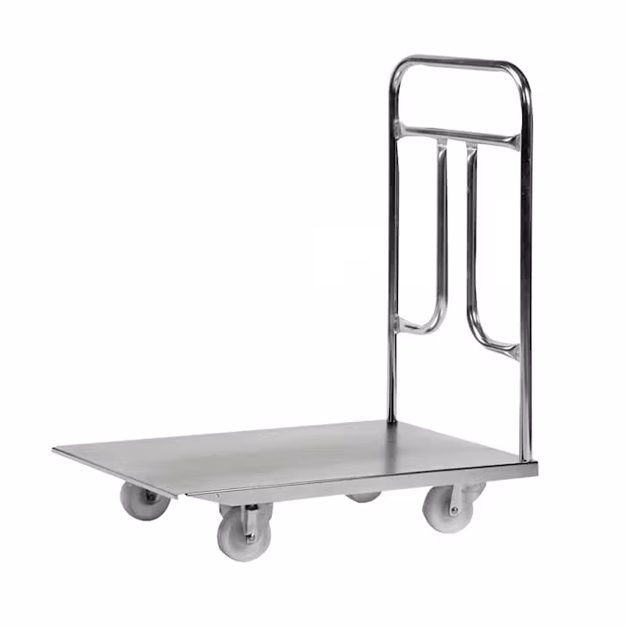 Lätt och smidig platåvagn med stor kapacitet. Slitstarka nylonhjul.