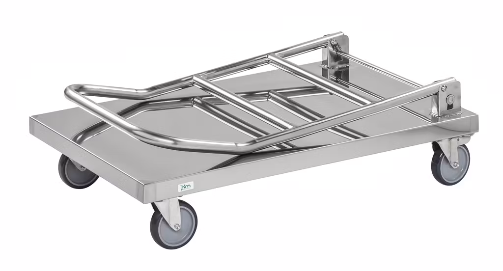 Enkel rostfri vagn med fällbart handtag som passar i de flesta områden. Slätt hyllplan som gör den lätt att torka av.