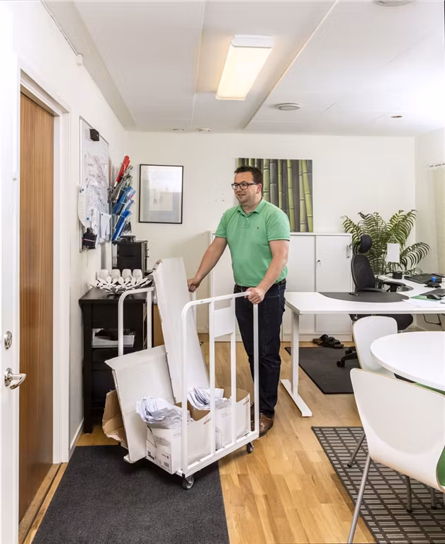 Liten flexibel vit pulverlackerad wellpapp rullcontainer för kontor med 50mm maskor i botten. 4st 100 mm länkhjul varav 2 med broms. Ideal för lagring / förflyttning av kartong / skivor.